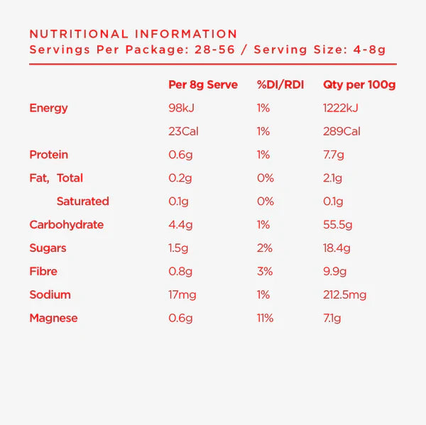 - Ingredients : Maca Root Powder*, Red Beetroot Powder*, Noni Powder*, Maqui Berry*, Natural Flavours, Matcha Green Tea Leaf Powder*, Aloe Vera Powder*, Red Reishi*, Rhodiola rosea*, Powdered Guarana Extract*, Panax ginseng Powder*, Acidity Regulator (Citric Acid), Silicon dioxide, Cacao Powder*, Sweetener (Thaumatin). Contains caffeine. *denotes Certified Organic.