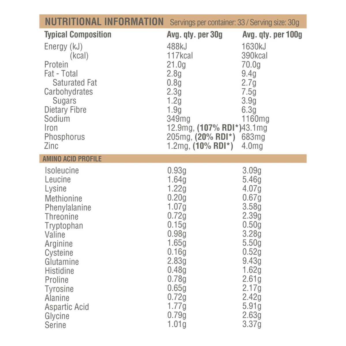 Organic Sprouted & Fermented Golden Pea Protein*, Superfood Blend (Organic Cocoa*, Sea Mineral Complex [74+ Trace Minerals], Organic Spinach*, Organic Spirulina*, Organic Chlorella*), Natural Flavours, Herb & Spice Blend (Organic Cinnamon*, Organic Liquorice*, Organic Ginger*, Organic Dandelion*, Organic Ginkgo Biloba*, Organic Siberian Ginseng*, Organic Milk Thistle*, Organic Cayenne Pepper*, Organic Gotu Kola*, Organic Cloves*), Organic Acacia Gum*, Organic Stevia Leaf Extract*, Digestive Enzyme (Bromelain). *Certified Organic.