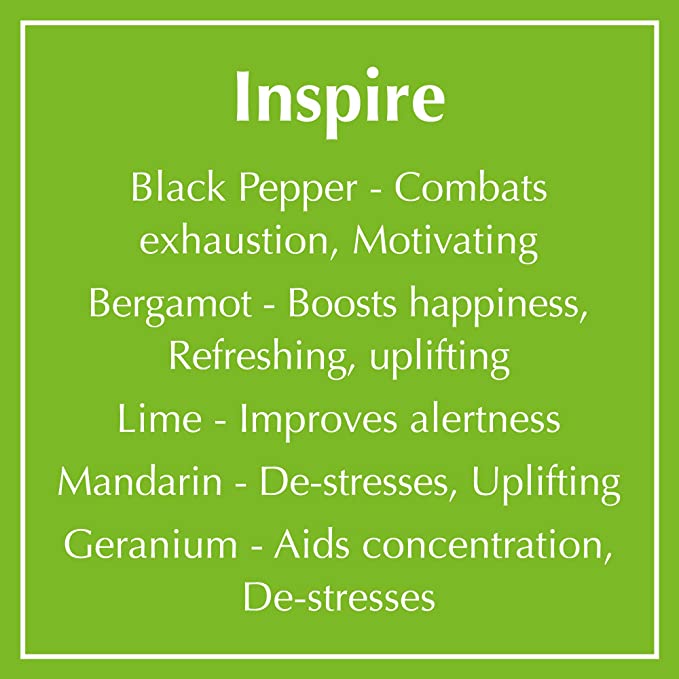 Inspire’s blend of essential oils will help to combat mental fatigue, soothe your mind and calm your nerves. This warm, comforting aroma combines top notes of spicy Black Pepper with the freshness of uplifting Lime and the refreshing fruity-sweet notes of Bergamot, bringing you a beautifully balanced blend that will leave you feeling uplifted, creative, motivated, and emotionally restored.