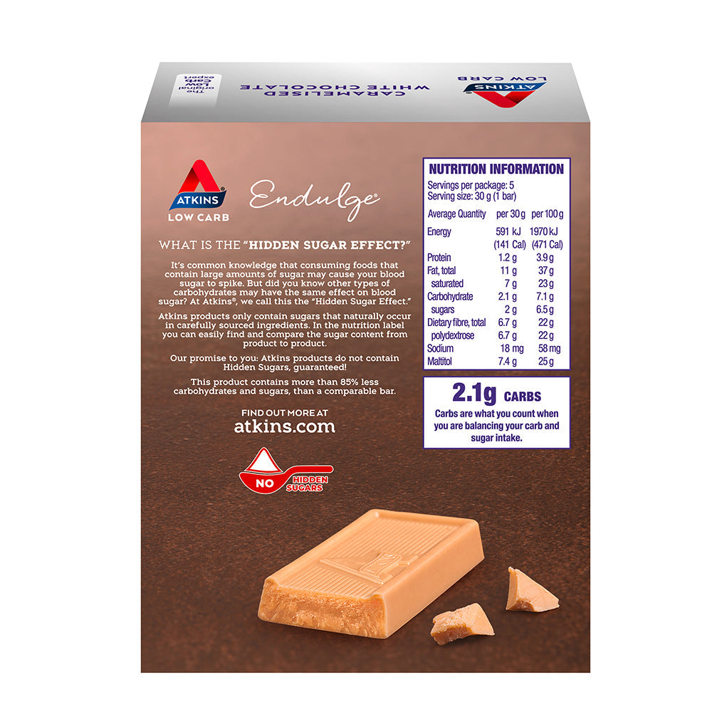 Atkins Endulge Caramelised White Chocolate Low Carb Bar 5 Pack provides delicious indulgence without the guilt. Each bar contains only 4g of net carbs per serving, creating a snack you can enjoy without breaking your low carb diet. Satisfy your sweet tooth the healthy way!