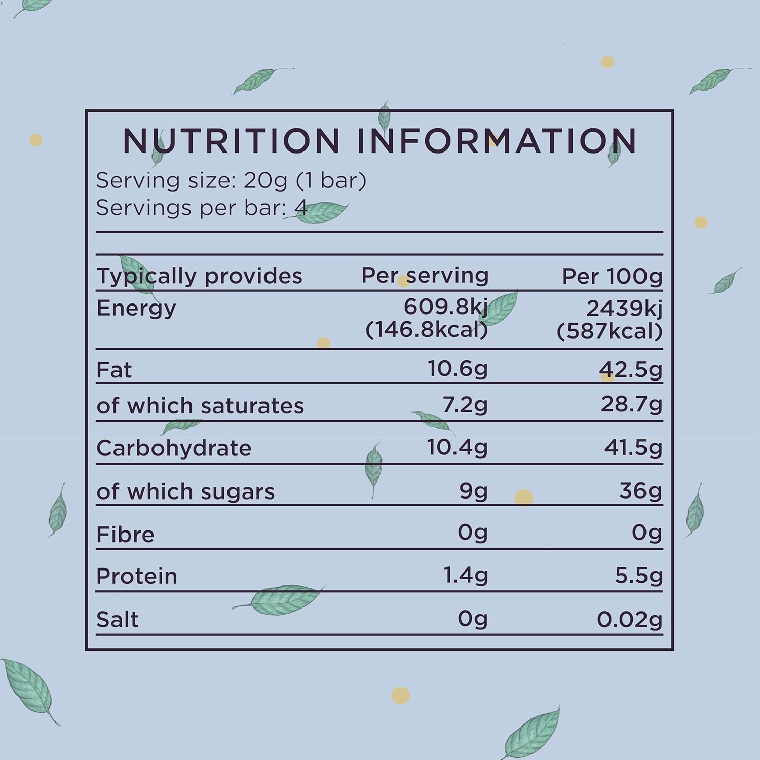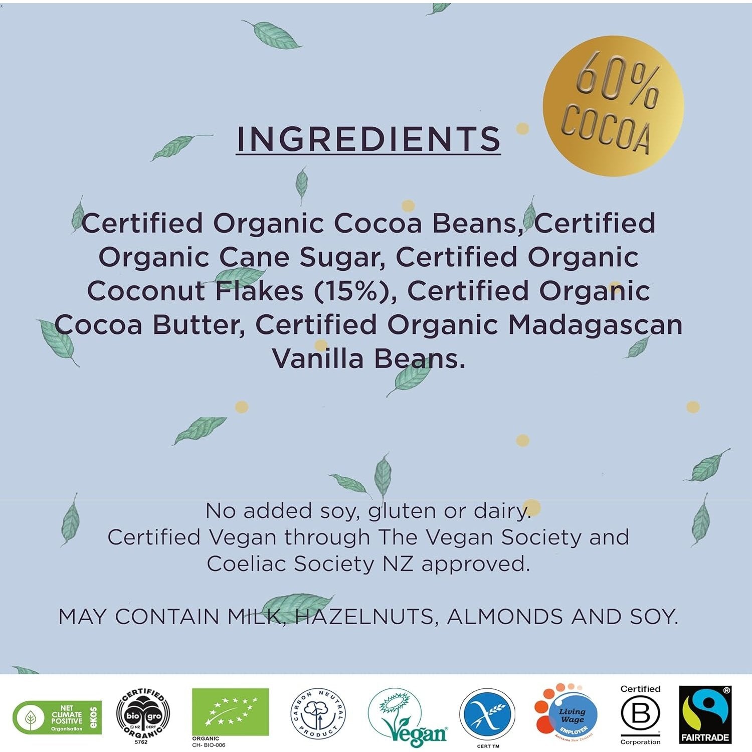Cocoa Beans*, Cane Sugar*, Coconut Flakes (15%)*, Cocoa Butter*, Madagascar Vanilla*. *Certified Organic.
