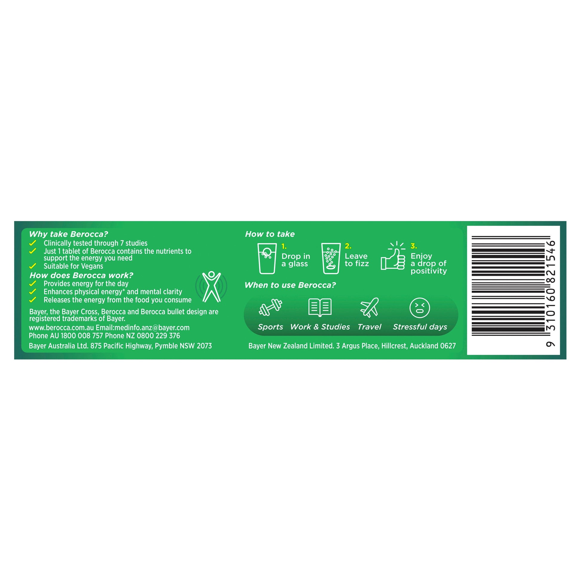 Each of the vitamins and minerals have been specifically chosen in the formulation of Berocca Performance to assist in energy release and help meet the requirements for optimal performance each day.