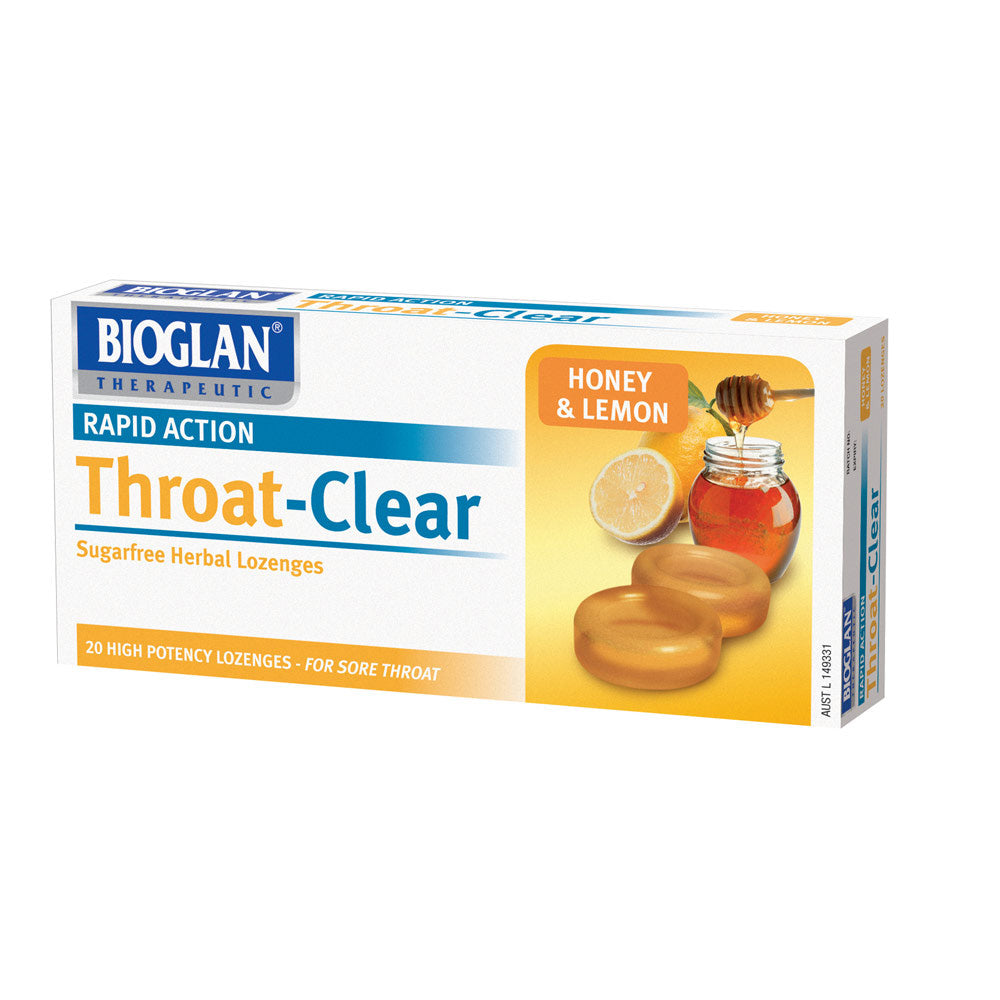 Bioglan Throat Clear Lozenges Honey and Lemon X 20 provide relief of a sore throat, blocked nose, mucous congestion and soothes symptoms from coughs.