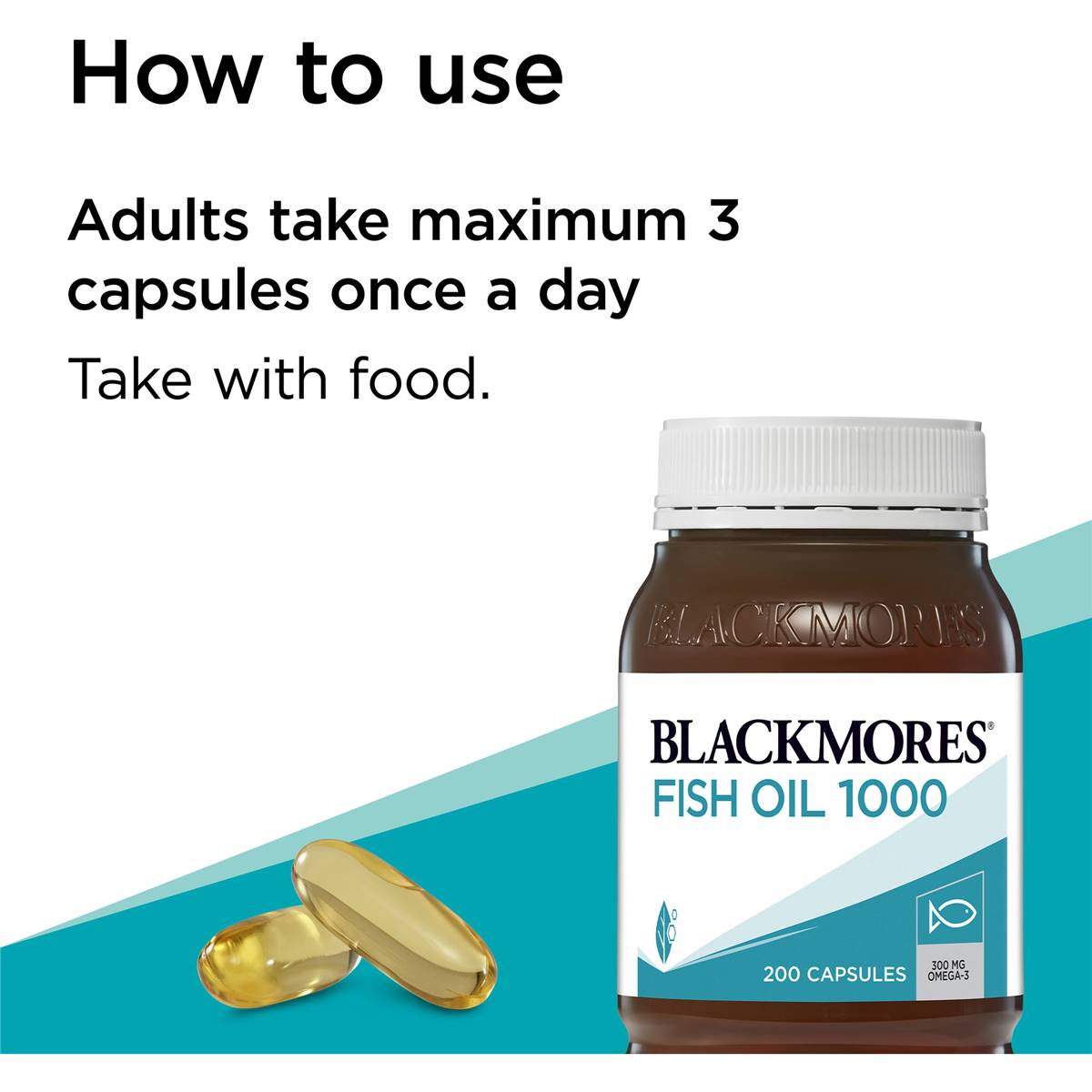 Blackmores Fish Oil 1000 provides a high-quality natural source of omega-3. It contains 300 mg of omega-3 per capsule to maintain heart, skin, eye and brain health and is ideal if you don't eat fish 2-3 times per weekAll Blackmores fish oil is extracted from 100% wild caught small fish. The specialised extraction process ensures purified, high quality oil that is rigorously tested for mercury, dioxins and PCBs.