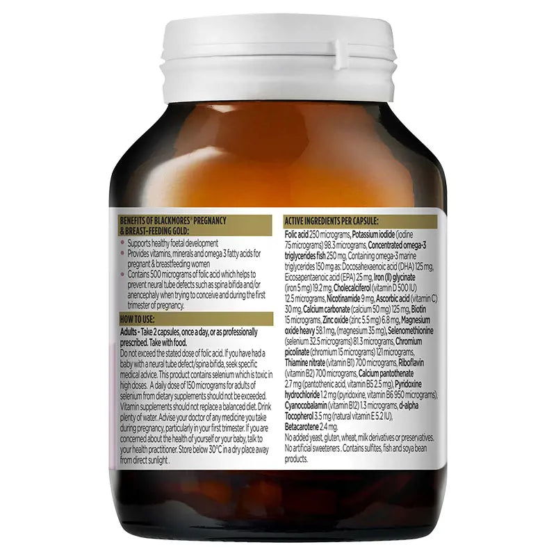 Blackmores Pregnancy & Breast-Feeding Gold provides an ideal daily dose of 20 important nutrients for mother and baby including folic acid, iodine and vitamin D3. With omega-3 DHA to support baby’s brain, eyesight and nervous system development and a lower constipation iron.