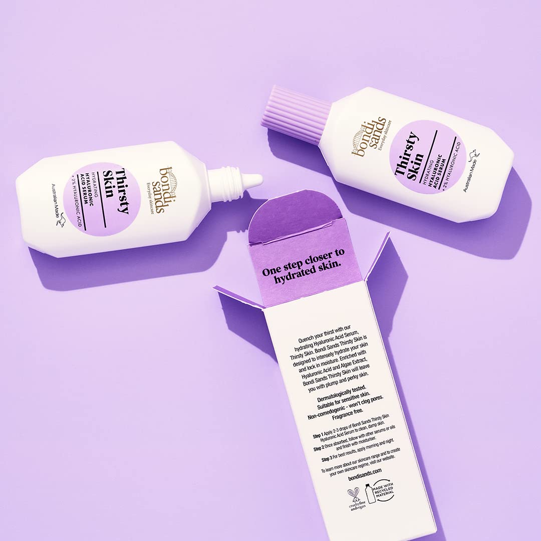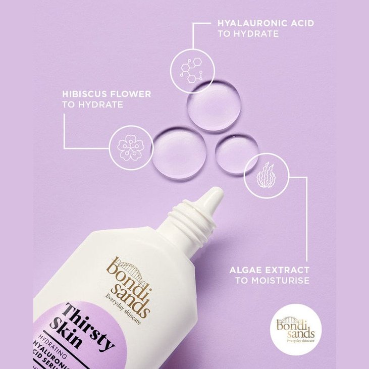 Quench your thirst with our hydrating Hyaluronic Acid Serum, Thirsty Skin. Bondi Sands Thirsty Skin is designed to intensely hydrate your skin and lock in moisture.