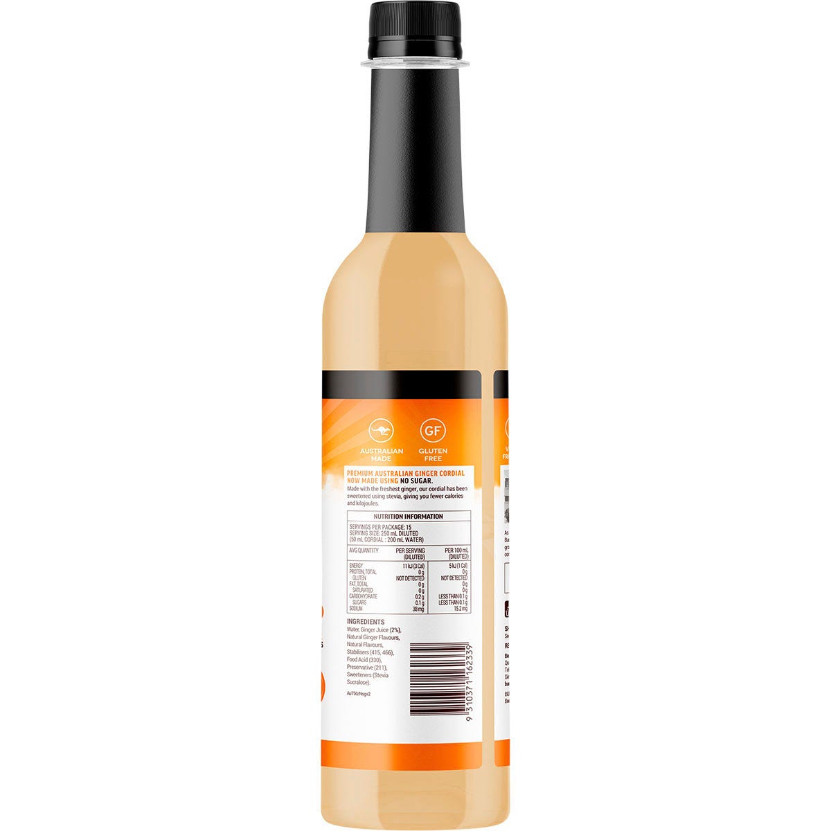 Water, Ginger Juice (2%), N/Atural Ginger Flavours, Natural Flavours,Stabilisers (466, 415), Food Acid (330), Preservative (211), Sweeteners (Stevia, Sucralose.