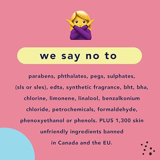 Parabens, Phthalates, PEGs, Sulphates (SLS or SLES), EDTA, Synthetic Fragrance, BHT, BHA, Chlorine, Benzalkonium Chloride, Petrochemicals, Formaldehyde, Phenoxyethanol or Phenols.