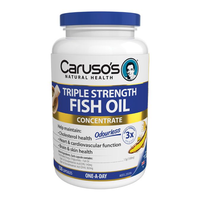 Caruso's Triple Strength Fish Oil has been specifically formulated for those who wish to take a convenient triple strength fish oil supplement and gain the benefits associated with Omega-3 essential fatty acids, including the reduction of osteoarthritis symptoms, as well as general cardiovascular, brain and skin health. Caruso's Triple Strength Fish Oil has been formulated for: Osteoarthritis, Cholesterol levels, Cardiovascular system, Blood circulation, Eczema, psoriasis and dermatitis, Brain function, Pregnant and lactating women.