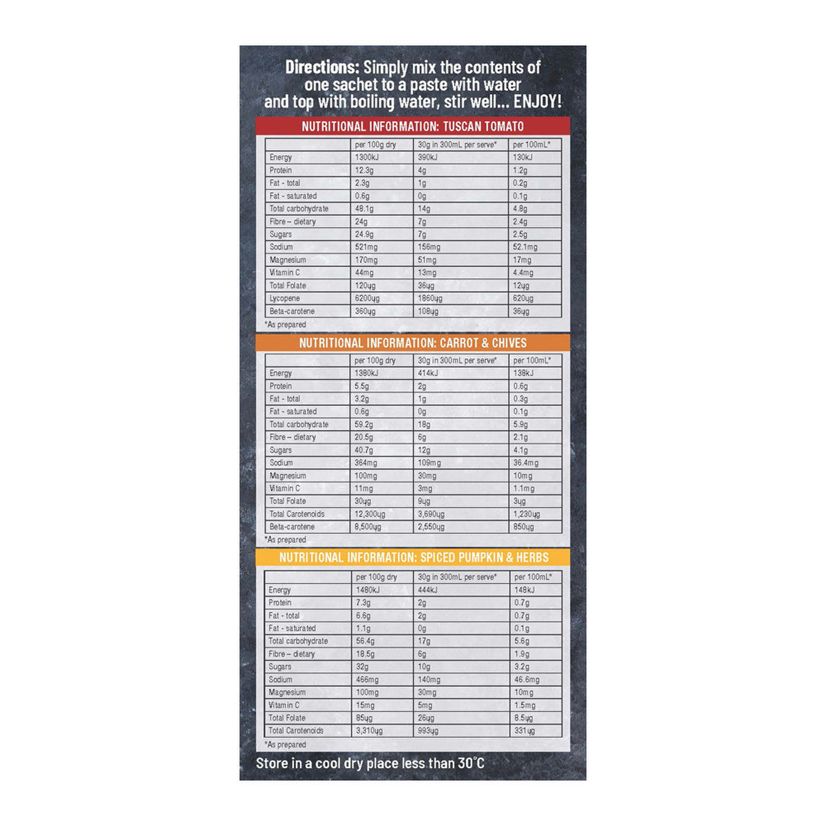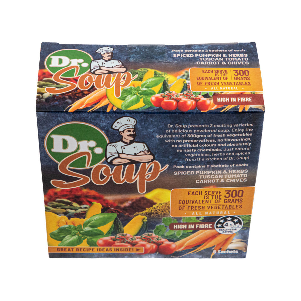 Cell-Logic Dr Soup Mixed Sachets (3 Flavours) 30g x 6 Pack (contains: 2 each of Spiced Pumpkin & Herbs, Tuscan Tomato and Carrot & Chives)