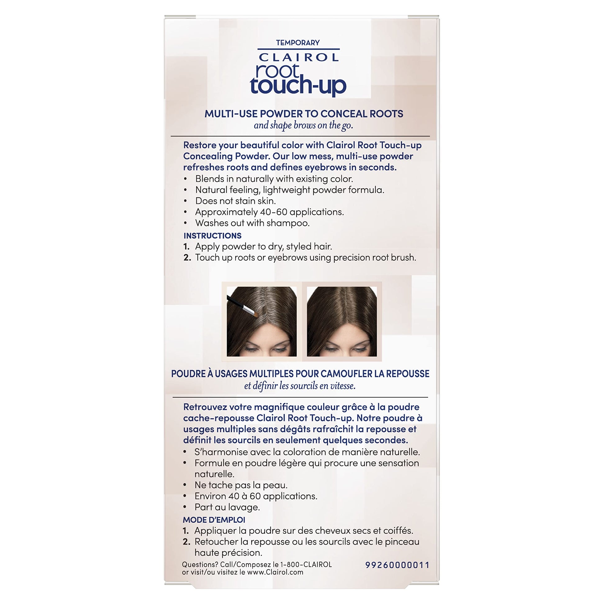 Never see a grey again! Temporary Root Touch-Up Concealing Powder quickly covers greys on the go. Our low mess, multi-use powder refreshes roots in seconds. Clairol Temporary Root Touch Up Powder, Dark Brown, blends in naturally with your existing shade, so you can easily conceal single strands, touch up your temples, refresh your rootline, or even define your eyebrows. It's a perfect spot treatment in between colouring that works in just seconds. Keep it in your purse to refresh your grey coverage at any time.Size: 2.1g