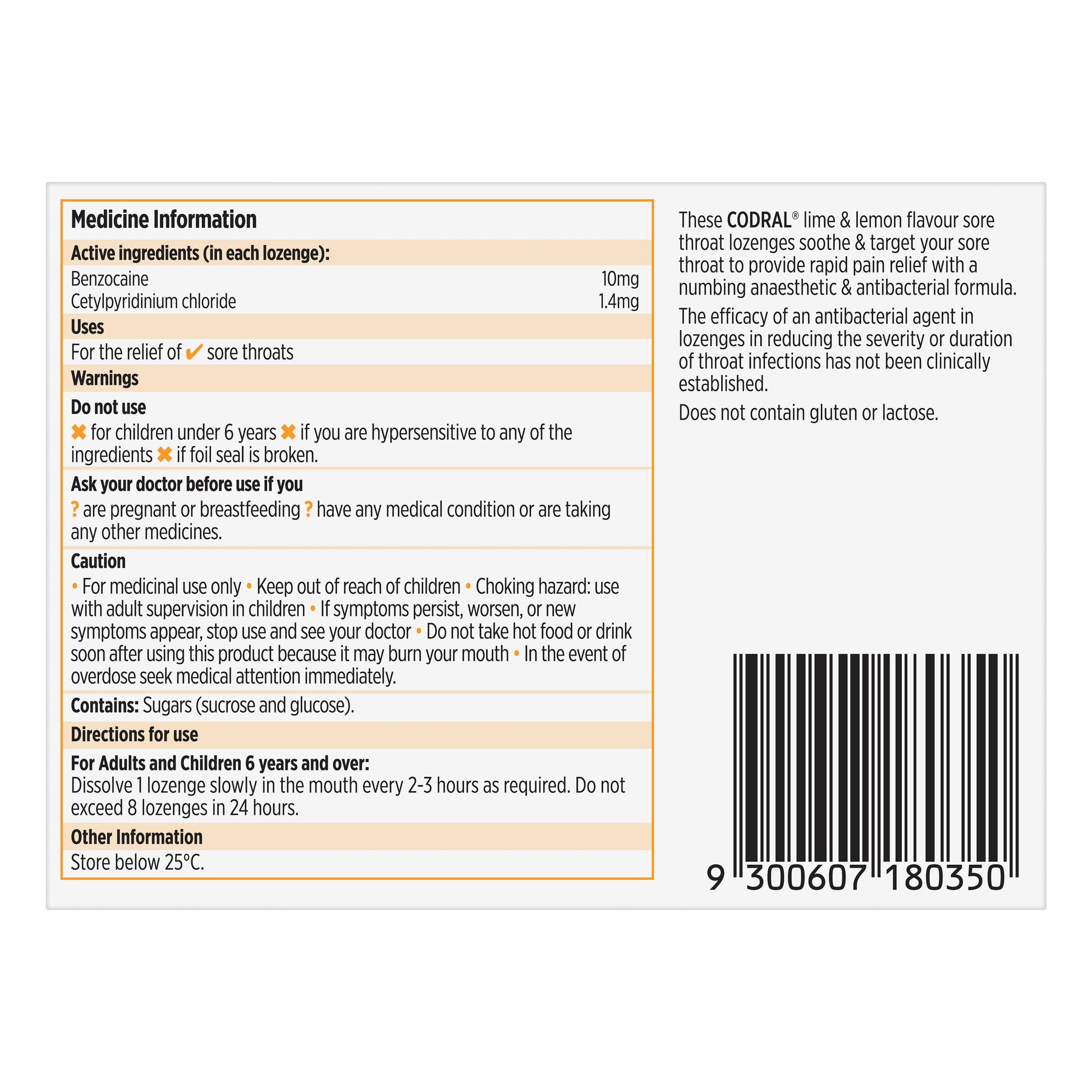 These Codral lime & lemon flavour sore throat lozenges soothe & target your sore throat to provide rapid pain relief with a numbing anaesthetic & antibacterial formula.