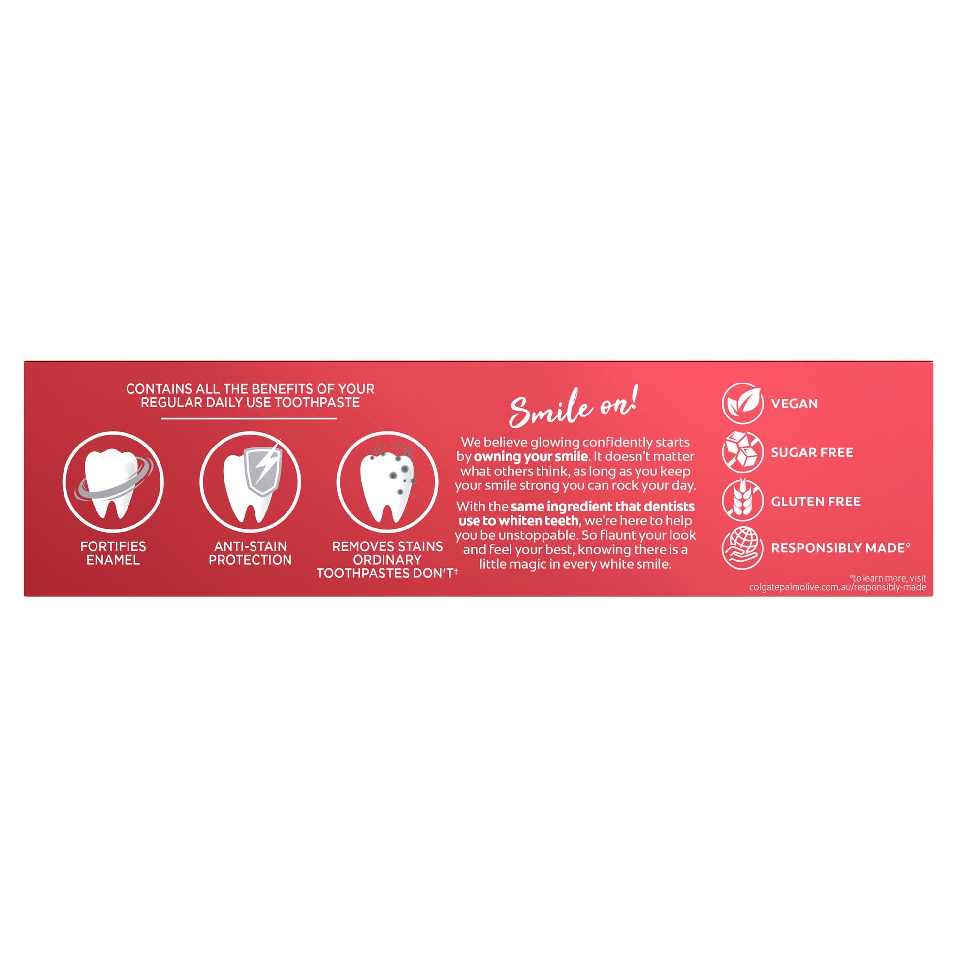 - All the benefits of a regular daily use toothpaste plus a whiter, brighter, bolder smile