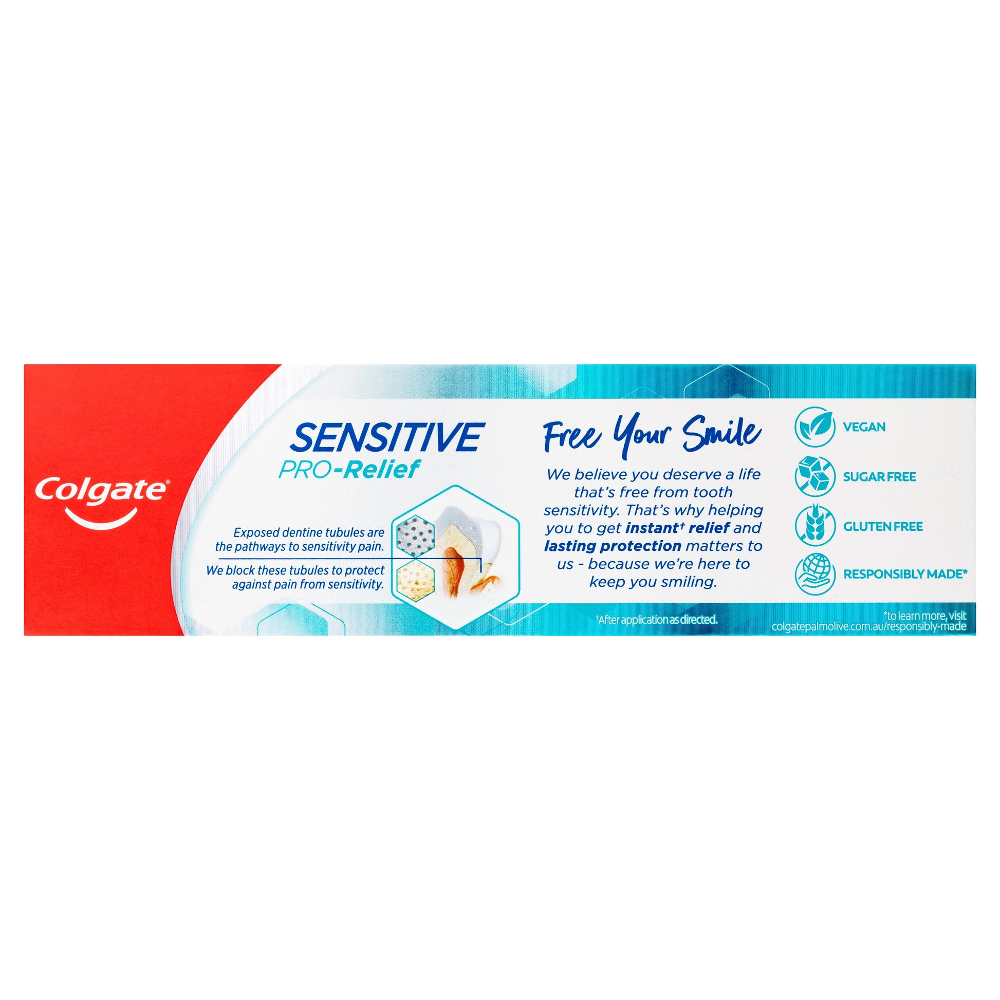 • Colgate Sensitive ProRelief Enamel Repair Toothpaste features a clinically proven amino acid formula with ProArgin® technology to provide sensitive teeth pain relief.• Instant Sensitive Teeth Pain Relief after applying directly onto sensitive area, and massaging for 1 minute.