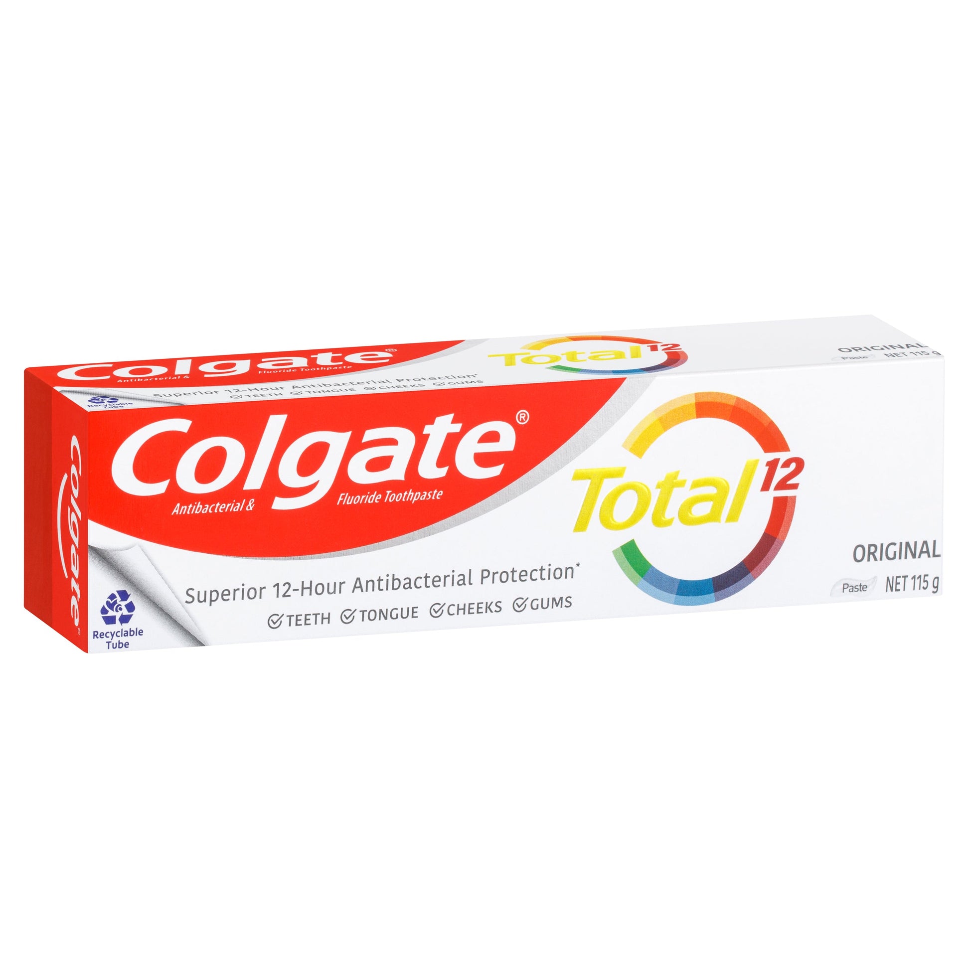 Colgate Total Original Antibacterial Fluoride Toothpaste reduces bacteria on teeth, tongue, cheeks and gums.
