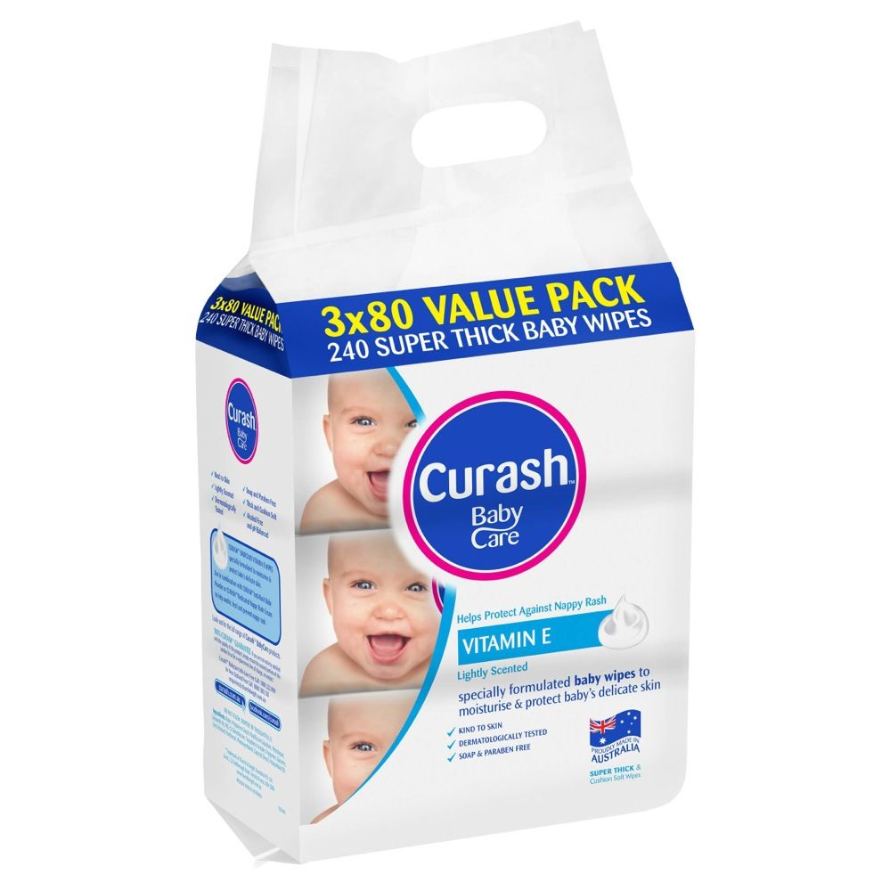 Curash™ Babycare Vitamin E Wipes are lightly scented and specially formulated wipes to moisturise & protect babies delicate skin. Value Pack contains 3x80s packs.