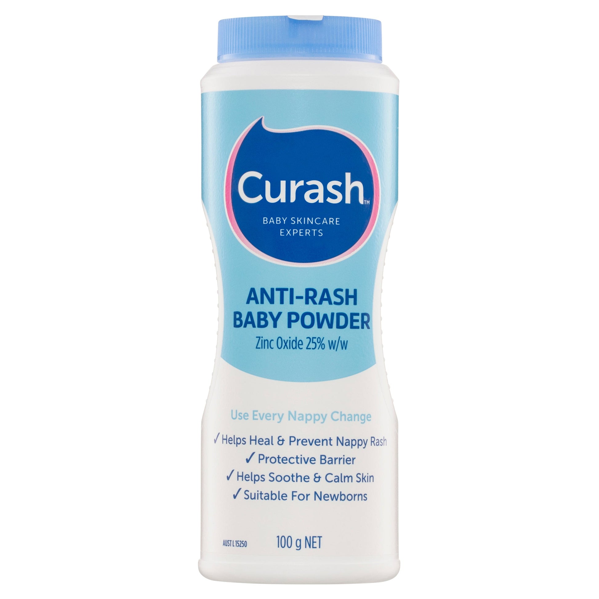 Curash Babycare Anti-Rash Baby Powder with cornstarch contains Zinc Oxide 25% w/w. Helps heal & prevent nappy rash, provides protective barrier and helps soothe and calm skin.