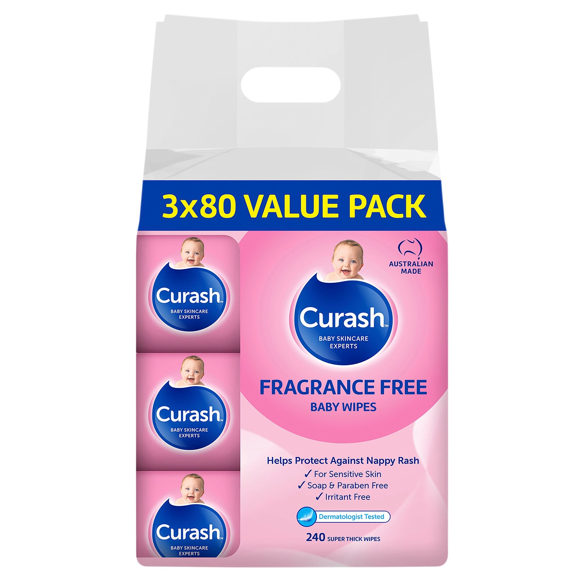 Curash™ Babycare Fragrance Free Baby Wipes are developed with your baby's delicate skin in mind. They are fragrance free and specially formulated baby wipes for sensitive skin.Size: 3x80 Pack