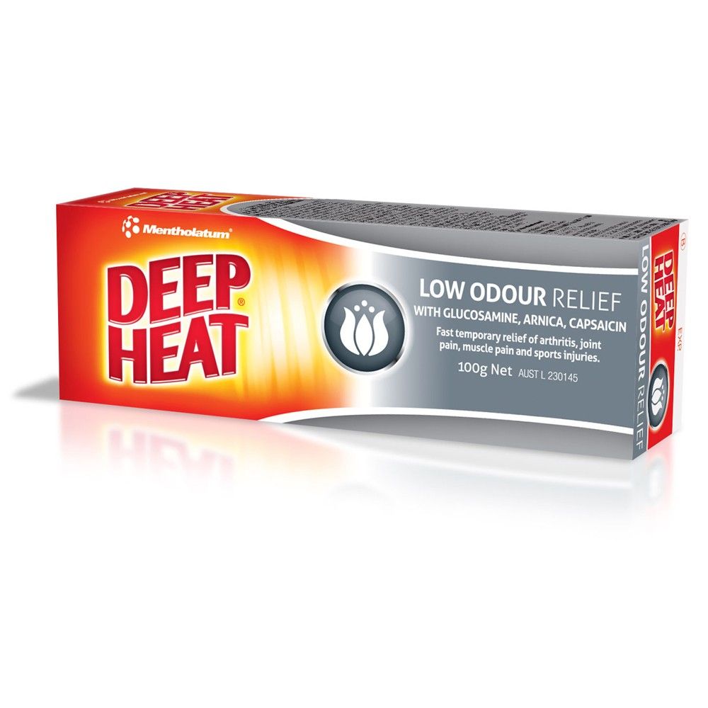 Deep Heat Low Odour Relief is a fast acting, targeted pain relief cream for the temporary relief of stiff, aching Muscle Pain, Joint Pain and Sports Injuries. With Natural Active Ingredients combining Glucosamine with the pleasant warming sensation of Capsaicin plus the benefits of Arnica, it helps relieve pain, reduce inflammation and swelling, as well as stimulate local blood circulation and improve healing of bruises.