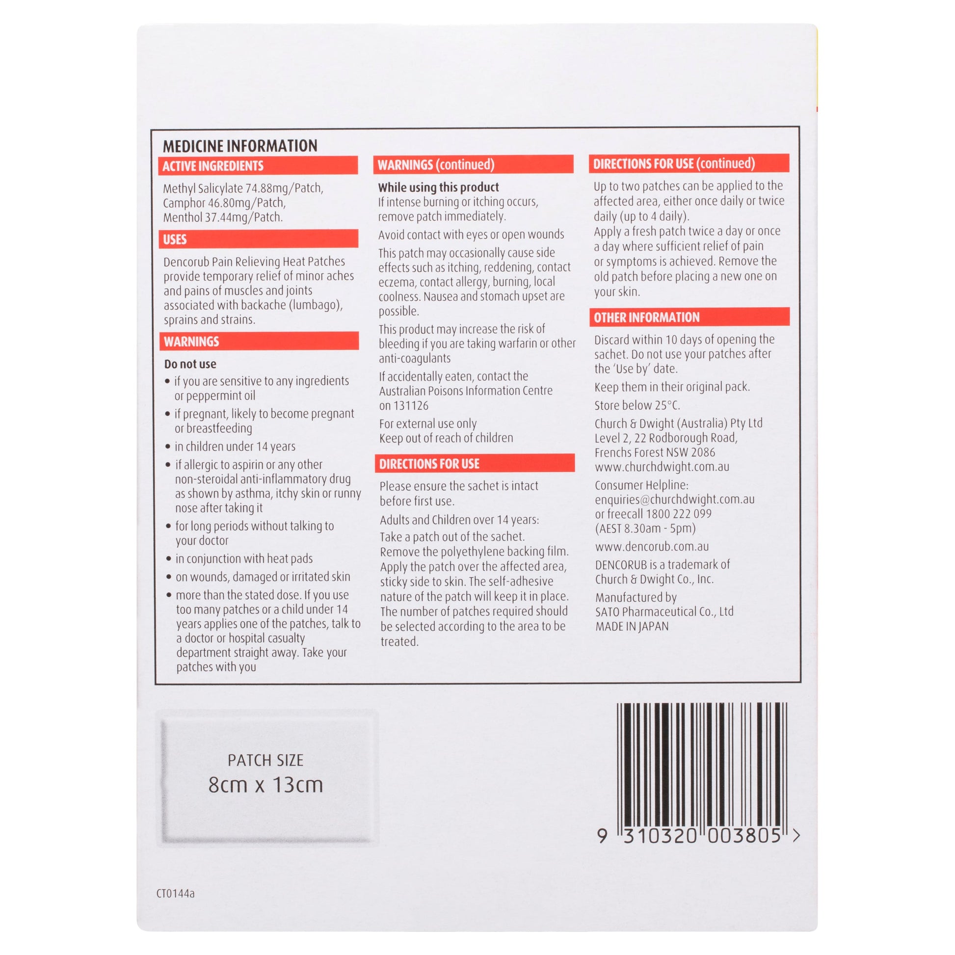 Dencorub Pain Relieving Heat Patches provide temporary relief of minor aches and pains of muscles and joints associated with backache (lumbago), sprains and strains.
