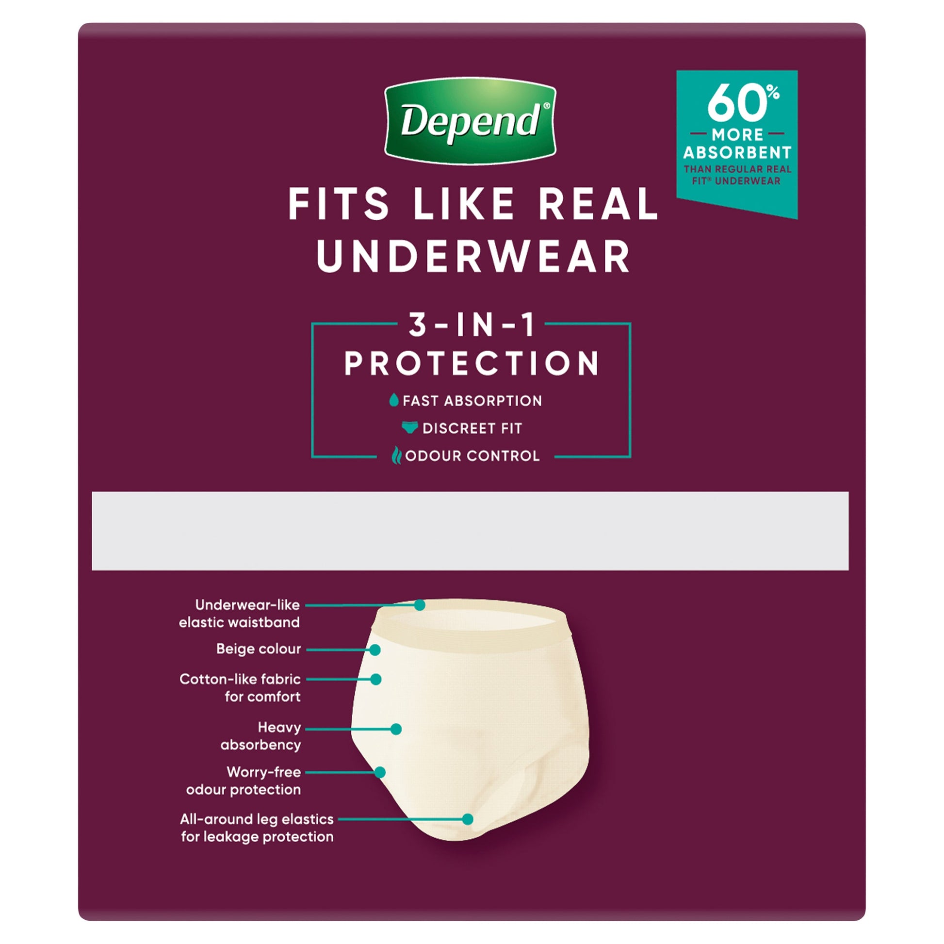 • Depend Real Fit Super for women is 60% more absorbent than regular Real Fit underwear making it ideal for heavy bladder leakage and overnight protection