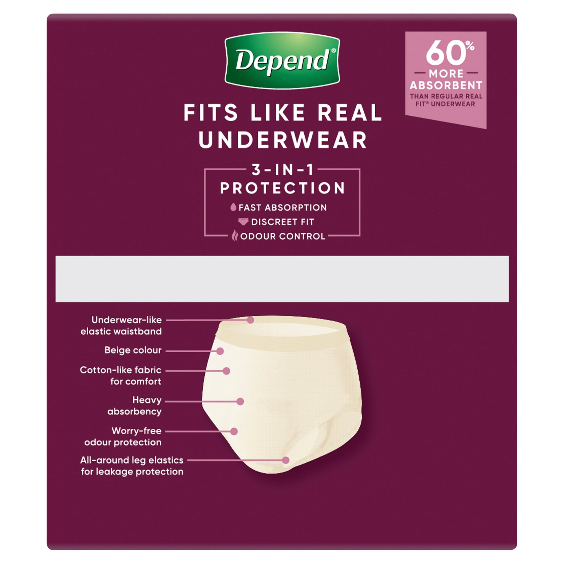 Depend® Real-Fit Super Underwear for Women is specifically designed to fit and feel like real underwear and protect against heavy loss of bladder control. Depend® incontinence underwear is soft, discreet and breathable making it very comfortable to wear. It is 60% more absorbent than regular Real-Fit underwear, making it ideal for overnight protection.
