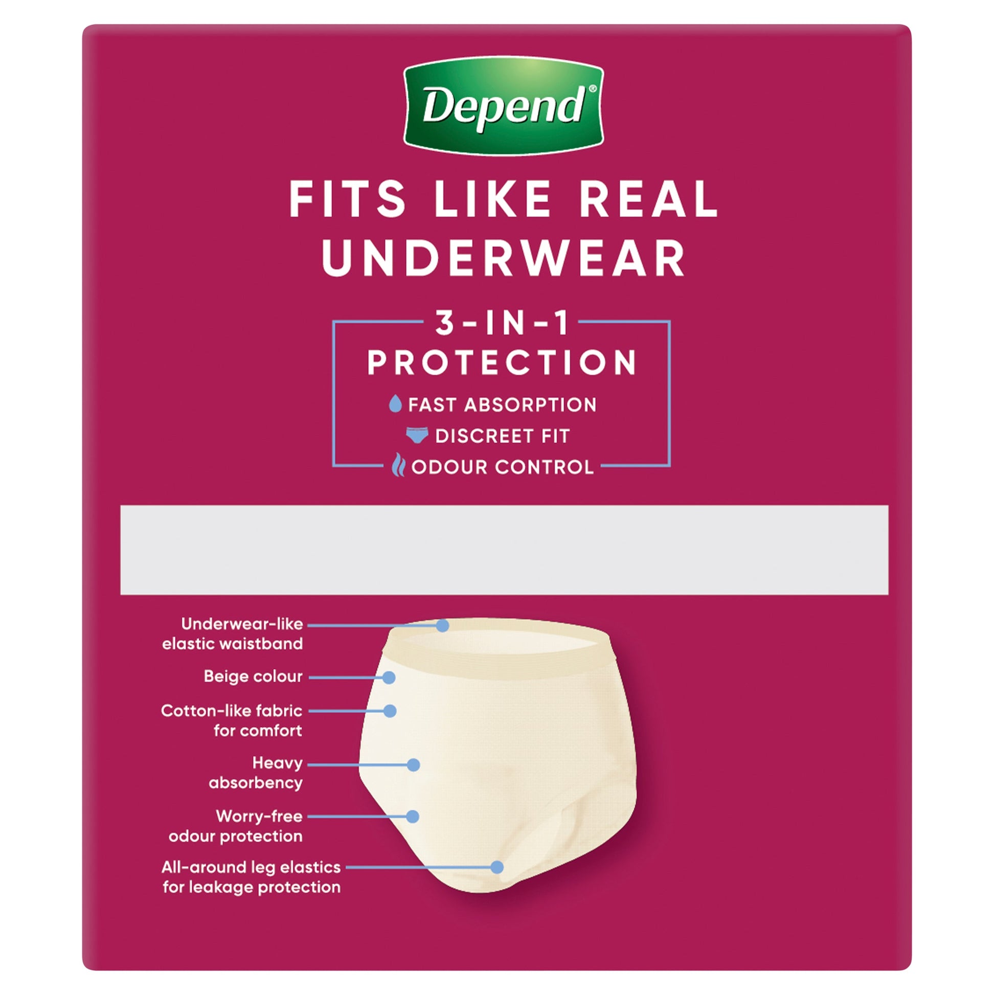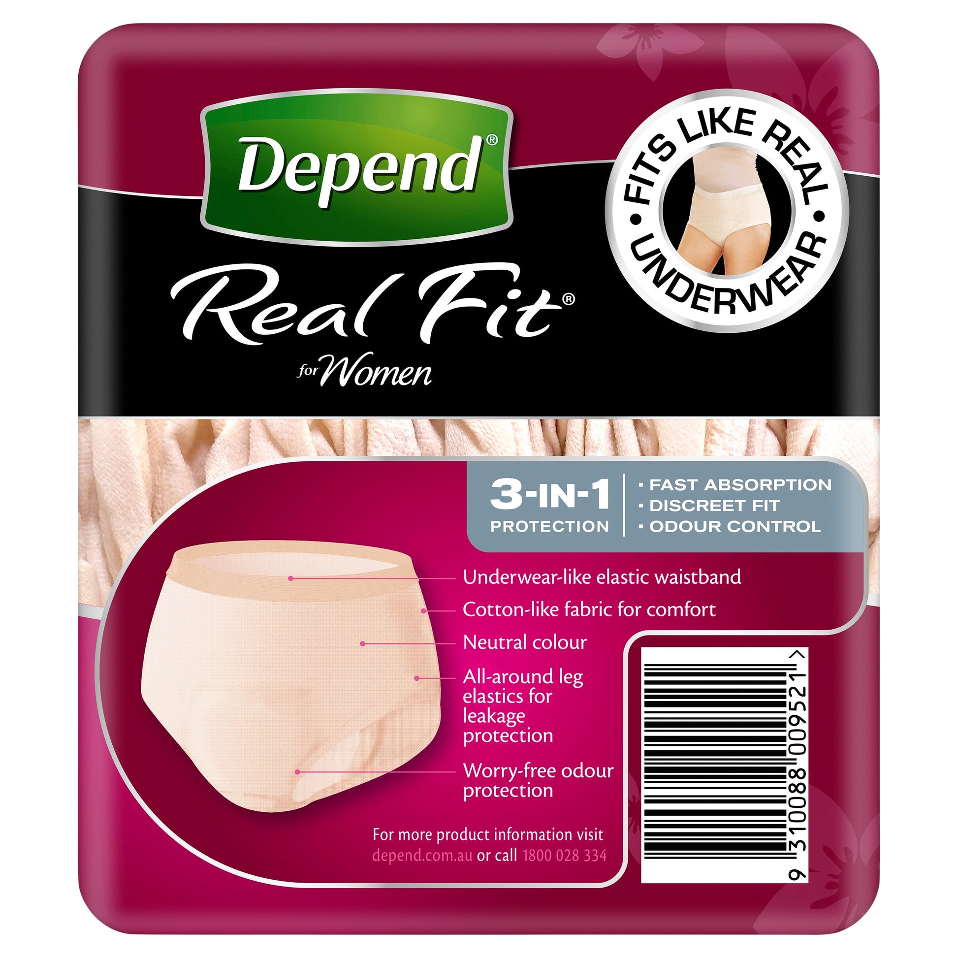 Depend® Real-Fit Underwear for Women is specifically designed to fit and feel like real underwear and protect against heavy loss of bladder control. Depend® incontinence underwear is soft, discreet and breathable.