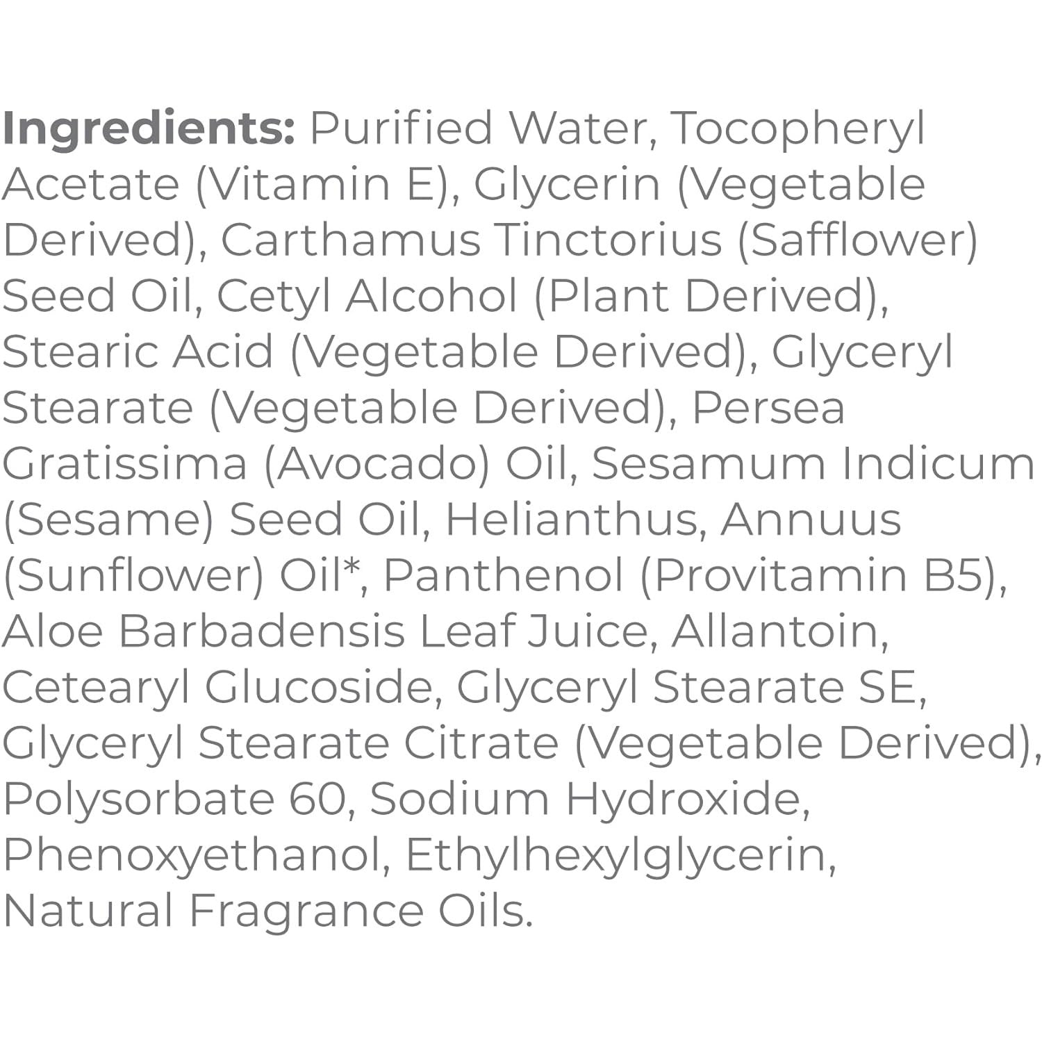 Purified Water, Tocopheryl Acetate (Vitamin E), Glycerin (Vegetable Derived), Carthamus Tinctorius (Safflower) Seed Oil, Cetyl Alcohol (Plant Derived), Stearic Acid (Vegetable Derived), Glyceryl Stearate (Vegetable Derived), Persea Gratissima (Avocado) Oil, Sesamum Indicum (Sesame) Seed Oil, Helianthus, *Annuus (Sunflower) Oil, Panthenol (Provitamin B5), Aloe Barbadensis Leaf Juice, Allantoin, Cetearyl Glucoside, Glyceryl Stearate SE, Glyceryl Stearate Citrate (Vegetable Derived), Polysorbate 60, Sodium Hydroxide, Phenoxyethanol, Ethylhexylglycerin, Natural Fragrance Oils.
