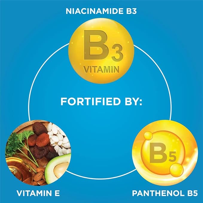 • Is fortified with vitamin E & essential B-vitamins, Niacinamide & Panthenol, for skin repair