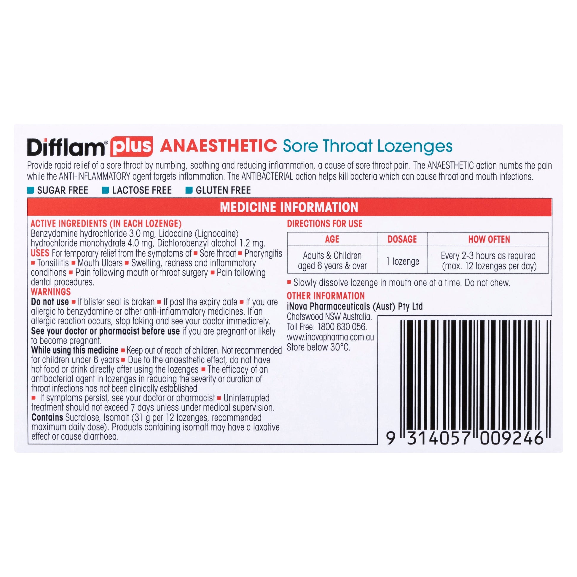 Each lozenge contains: Lignocaine hydrochloride 4mg , Benzydamine hydrochloride 3mg and Dichlorobenzyl alcohol 1.2mg.
