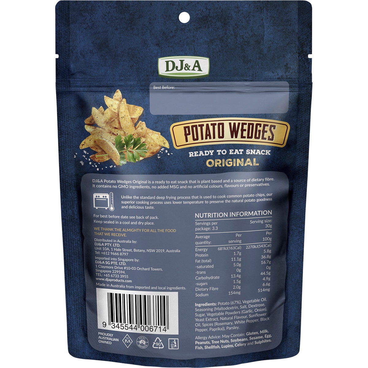 Indulge in the deliciousness of DJ&A Potato Wedges! Made with natural ingredients, these original flavor wedges are perfect for snacking or as a side dish. Each box contains 9 packs of 100g wedges, giving you plenty to share or enjoy on your own. Satisfy your cravings with these crispy and flavorful potato wedges.