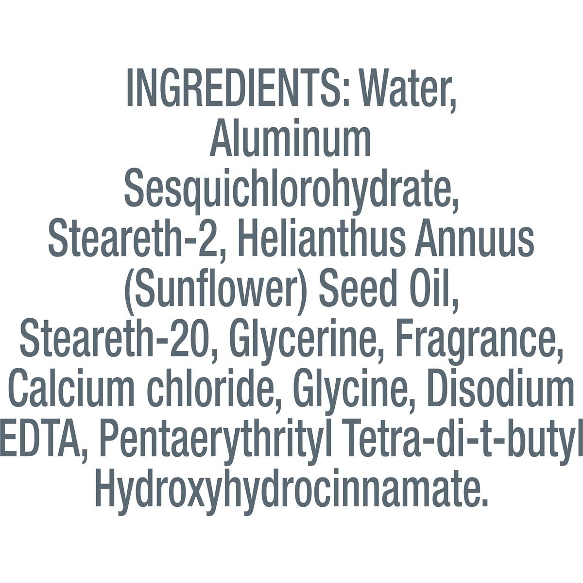 Ingredients: Water, Aluminum Sesquichlorohydrate,,Steareth-2, Helianthus Annuus (Sunflower) Seed Oil,, Steareth-20, Glycerin, Fragrance, Calcium Chlori,de, Glycine, Disodium EDTA, Pentaerythrityl Tetra-,di-t-butyl Hydroxyhydrocinnamate.