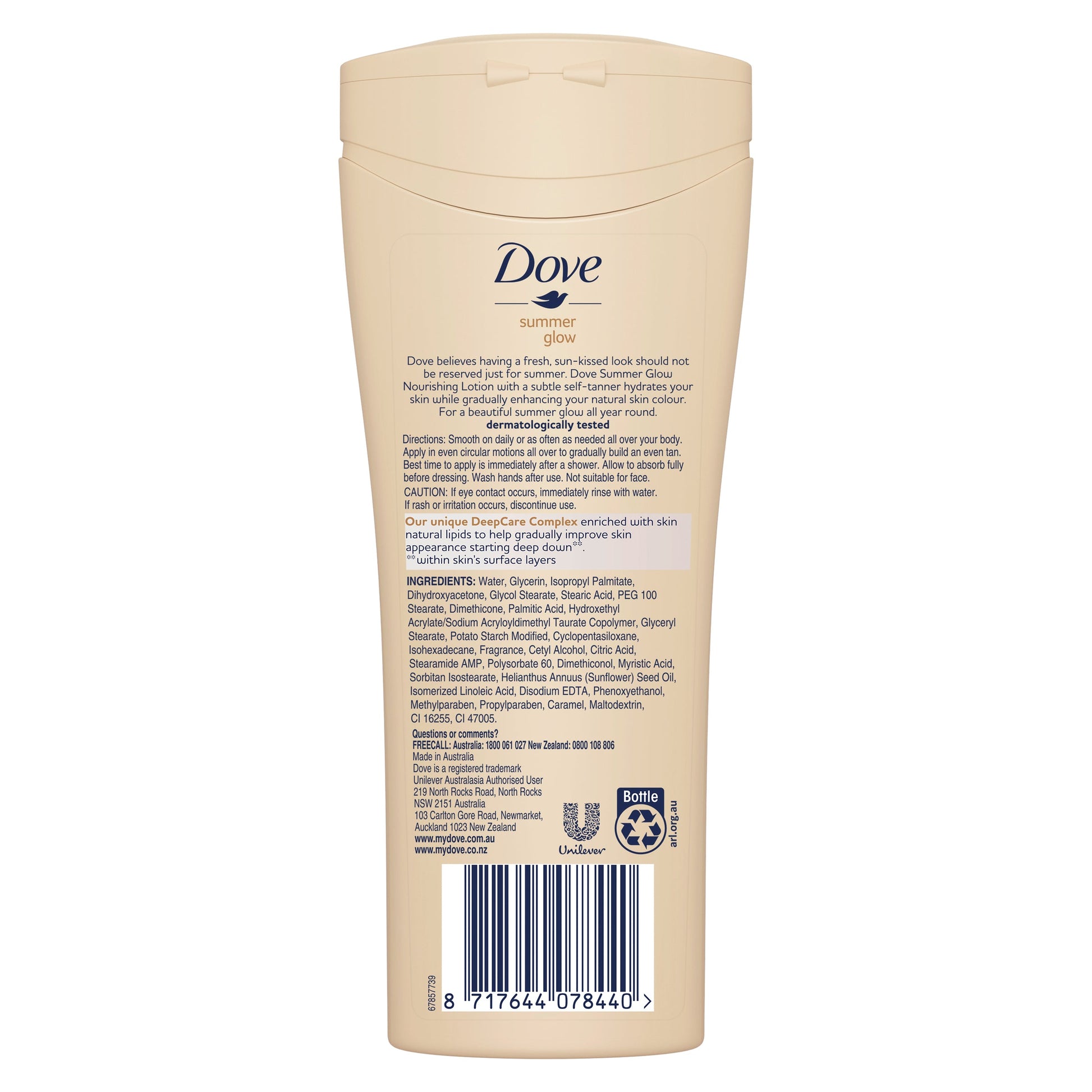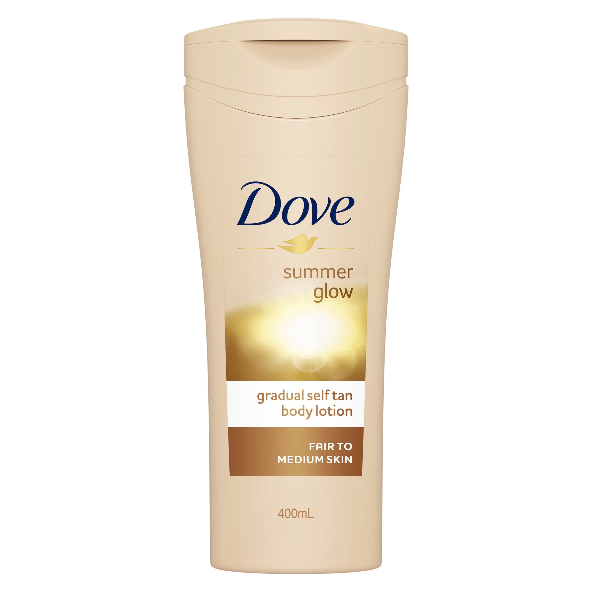 Longer days, summer clothes, picnics - there are lots of things we love about summer. If tanned, glowing skin is top of your list, you don't need the sun to get that summer glow. The safest route to skin that looks sun-kissed comes from a gradual self-tanner. Used regularly, Dove Summer Glow Gradual Self Tan Body Lotion Fair to Medium leaves fair and medium skin tones beautifully golden with a natural-looking tan while caring for your skin. Enriched with our unique DeepCare Complex, a blend of skin natural nutrients and rich essential oil, this body lotion nourishes skin deep down. So while you're gradually building a beautiful tan, you're also moisturising your skin to leave it feeling satin-smooth. So for a sun-kissed look all year round and sumptuously soft skin, reach for this sunshine-in-a-bottle and enjoy a summer glow, whatever the weather. Within the stratum corneum A smooth surface will help get a more even finish, so start by exfoliating your skin. Massage the lotion evenly over clean, dry skin with circular motions. Allow the body lotion to absorb into your skin before getting dressed and, once you're finished, remember to wash your hands. Planning on spending time in the sun? Apply a separate sunscreen product over the top once your skin is dry.Boxed Contents: 400ml