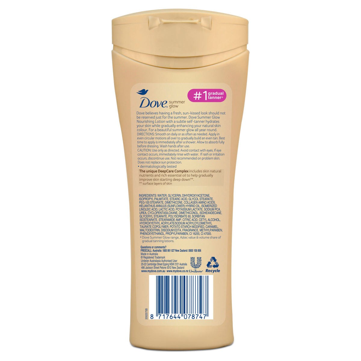 There’s a reason we feel so happy when the sun’s out: swimming outdoors, summer clothes, glowing skin. Wish you could have that beautiful, sun-kissed feeling all year round? Using a gradual self-tanner like Dove Summer Glow Gradual Self Tan Body Lotion Medium to Dark will give you that glow whatever the weather while also caring for your skin. This gradual self-tanner is specially formulated to give medium to dark complexions a radiant glow and natural-looking tan. As well as gradually building up colour, this dermatologically-tested body lotion also helps keep skin soft. Formulated with our unique DeepCare Complex, a blend of skin natural nutrients and rich essential oil, your skin is left deeply* nourished. So smooth on sunshine and enjoy radiant skin every season with Dove Summer Glow Gradual Self Tan Body Lotion Medium to Dark. *Within the stratum corneum Using large circular motions, massage Dove Summer Glow Gradual Self-Tan Body Lotion Medium to Dark into clean, dry skin using your hands or a tanning mitt. Allow the body lotion to fully absorb before getting dressed and remember to wash your hands. Planning on spending time in the sun? Always apply sunscreen over the top of your self-tanner once your skin is dry. Treat yourself to the skin care you deserve and restore your skin with this moisturizing lotion.