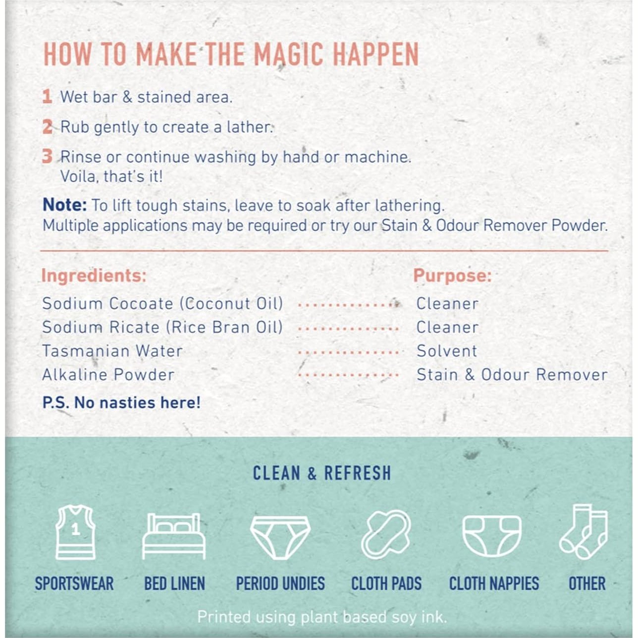 Note: To lift tough stains, leave to soak after lathering. Multiple applications may be required or try Stain Remover Powder.