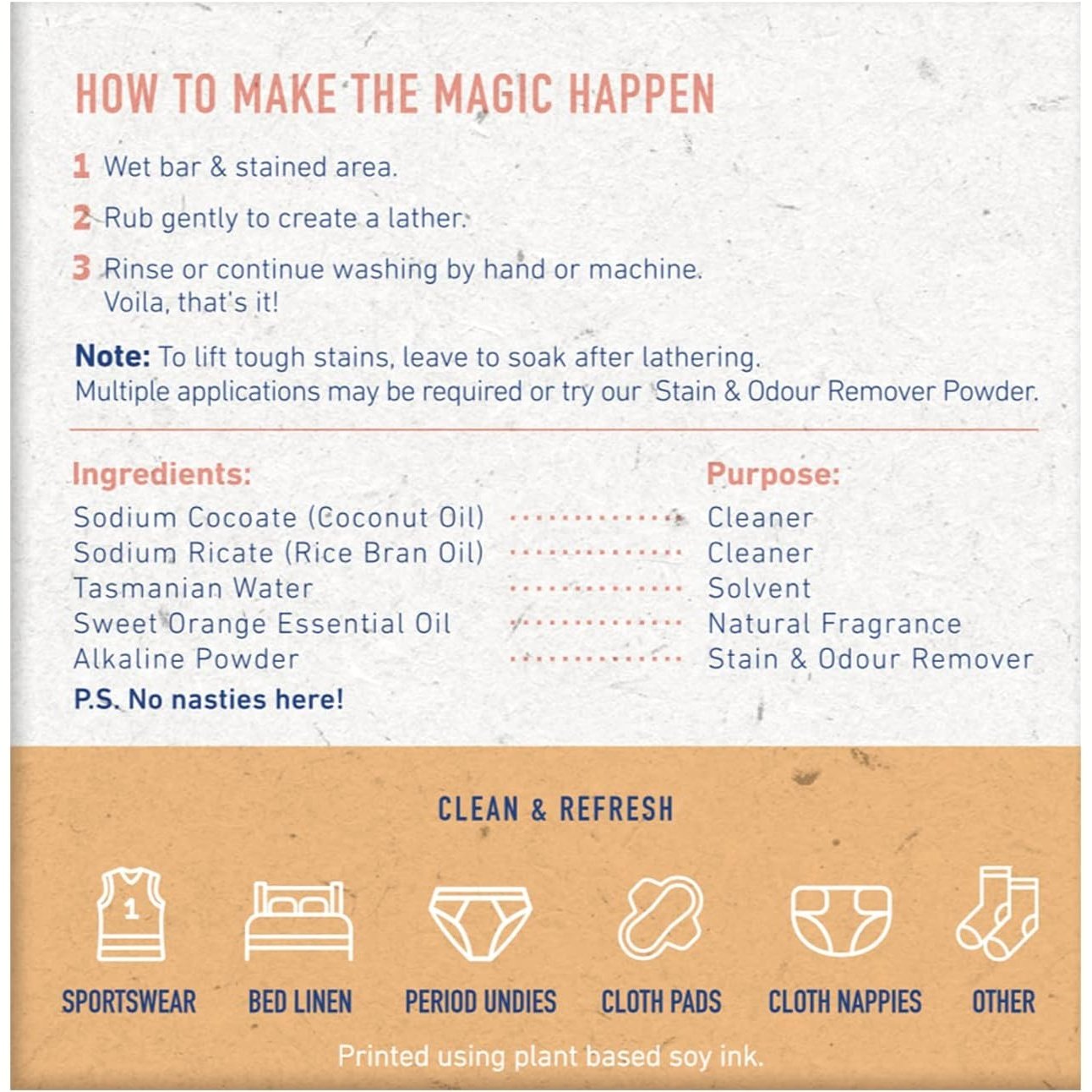Sodium Cocoate (Coconut Oil), Sodium Ricate (Rice Bran Oil), Aqua (Tasmanian Water), Citrus sinesis Essential Oil (Sweet Orange Oil), Alkaline Powder (Sodium Carbonate & Sodium Bicarbonate)