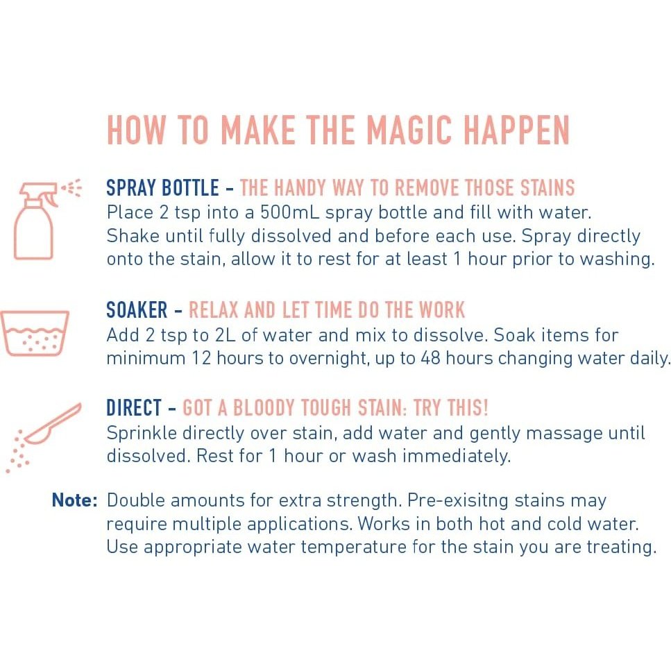 Spray bottle: Place 2 tsp into a 500ml spray bottle and fill with water. Shake until fully dissolved and before each use. Spray directly onto the stain, allow to rest for at least 1 hour prior to washing