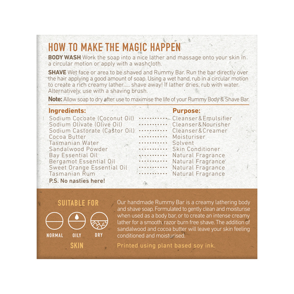 Our handmade Rummy Bar is a creamy lathering body and shave soap. Formulated to gently clean and moisturise when used as a body bar, or to create an intense creamy lather for a smooth, razor burn free shave. The addition of sandalwood and cocoa butter will leave your skin feeling conditioned and moisturised.
