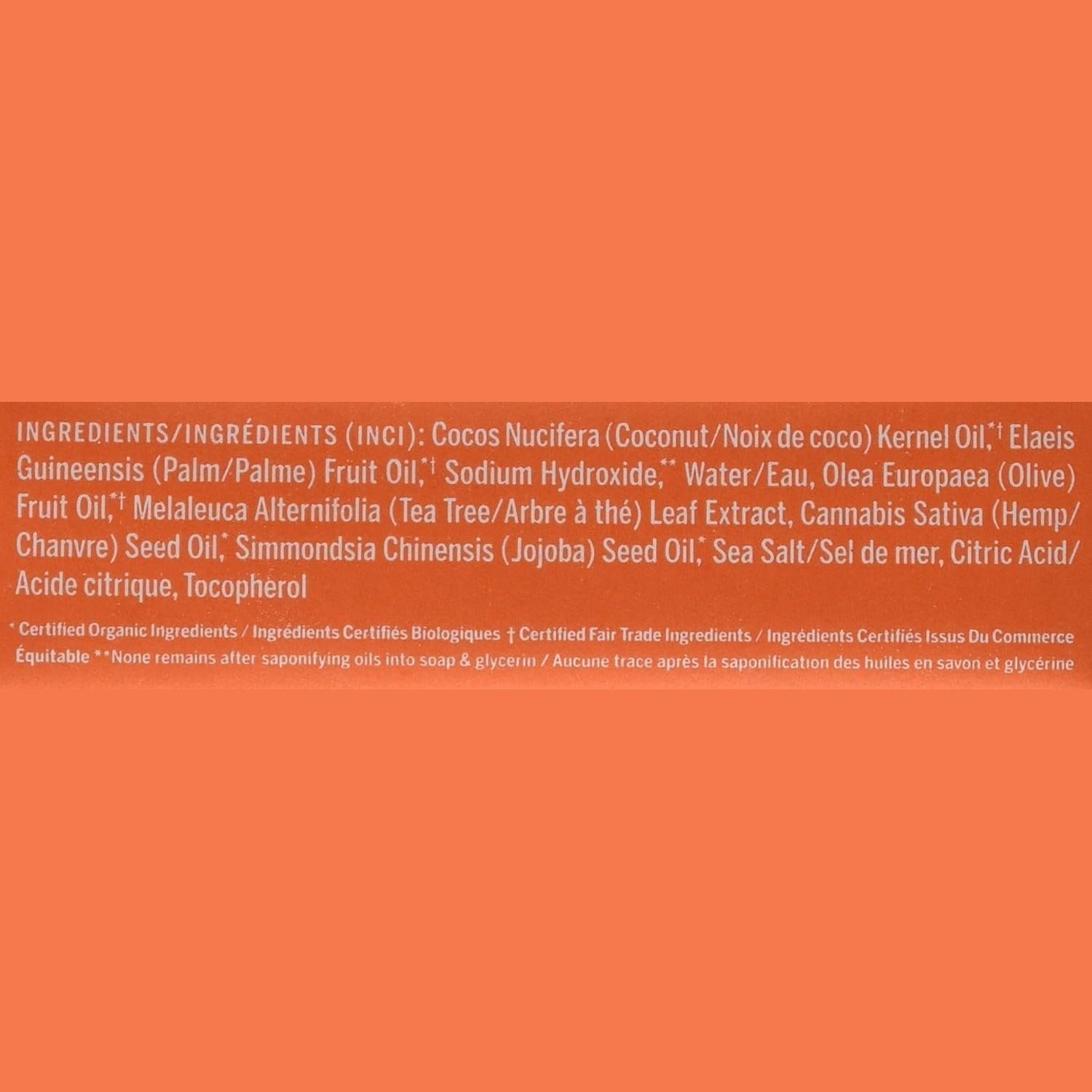Organic Coconut Oil*, Organic Palm Oil*, Sodium Hydroxide**, Water, Organic Olive Oil*, Tea Tree Extract, Organic Hemp Oil, Organic Jojoba Oil, Sea Salt, Citric Acid, Tocopherol