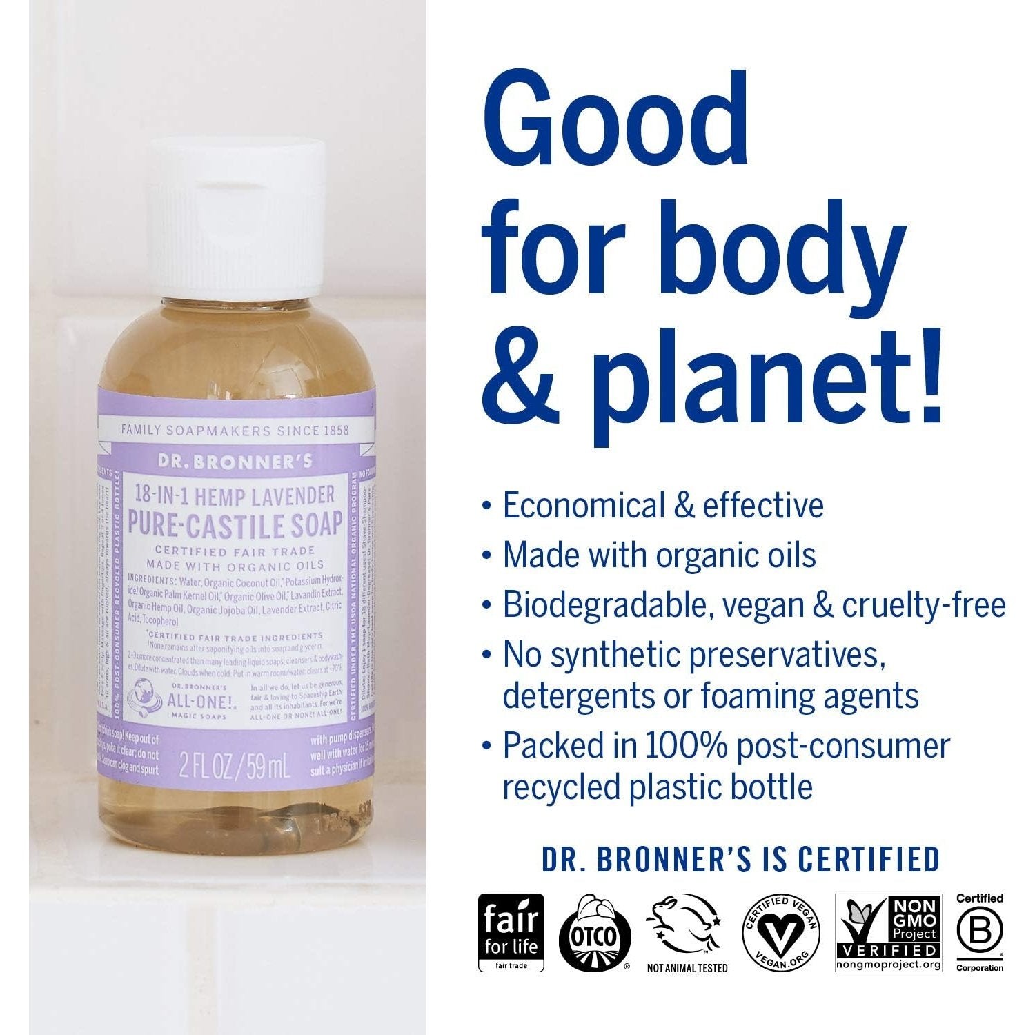 Dr. Bronner’s 18-in-1 Pure-Castile Soaps are good for just about any cleaning task. Face, body, hair – food, dishes, laundry, mopping, pets – clean your house and body with no synthetic preservatives, detergents or foaming agents – none!