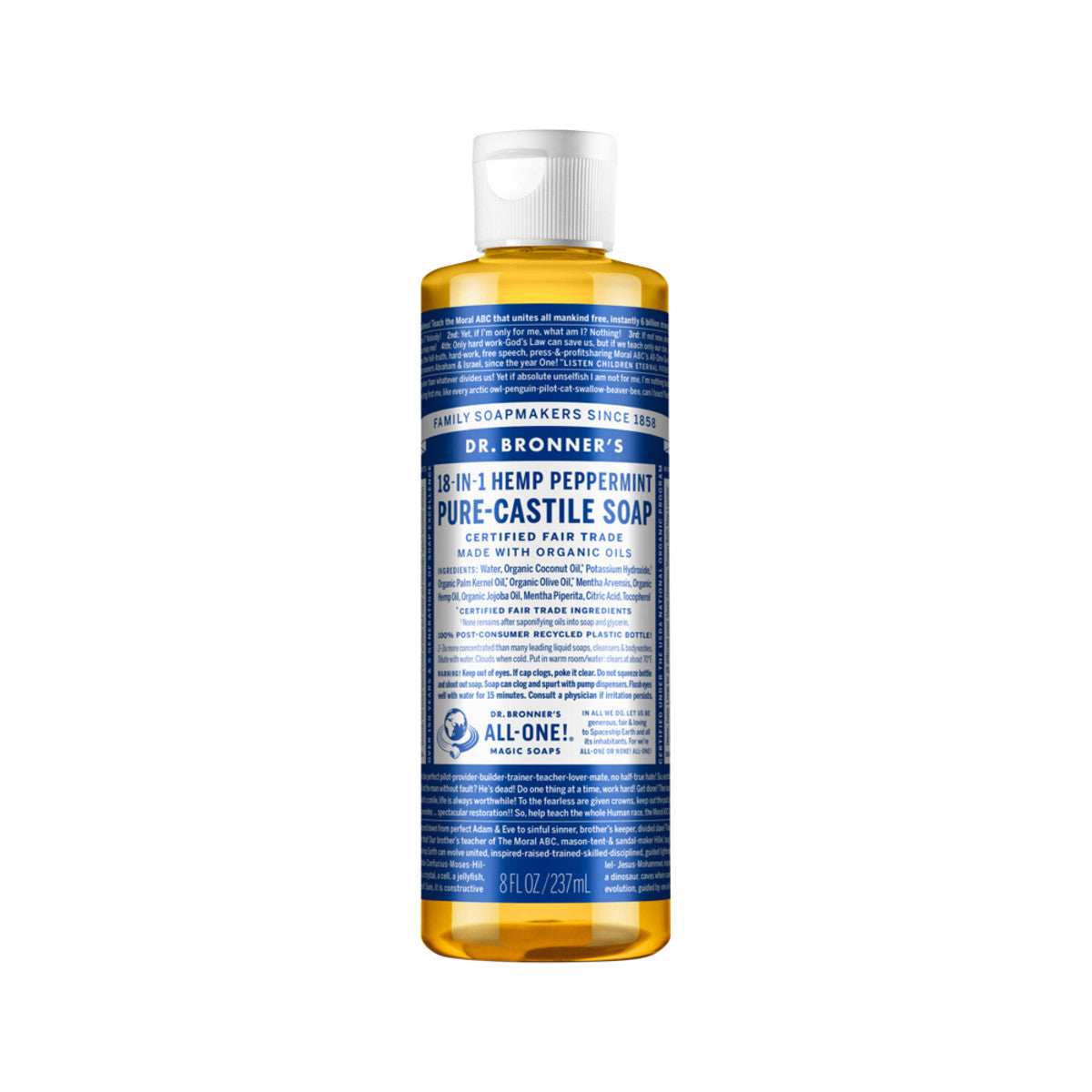 Dr. Bronner’s 18-in-1 Pure-Castile Soaps are good for just about any cleaning task. Face, body, hair – food, dishes, laundry, mopping, pets – clean your house and body with no synthetic preservatives, detergents or foaming agents – none!