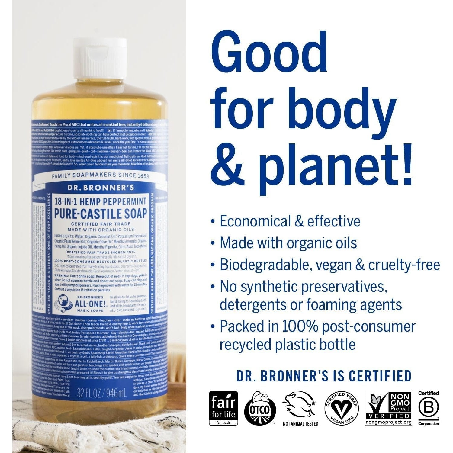 Dr. Bronner’s 18-in-1 Pure-Castile Soaps are good for just about any cleaning task. Face, body, hair – food, dishes, laundry, mopping, pets – clean your house and body with no synthetic preservatives, detergents or foaming agents – none!