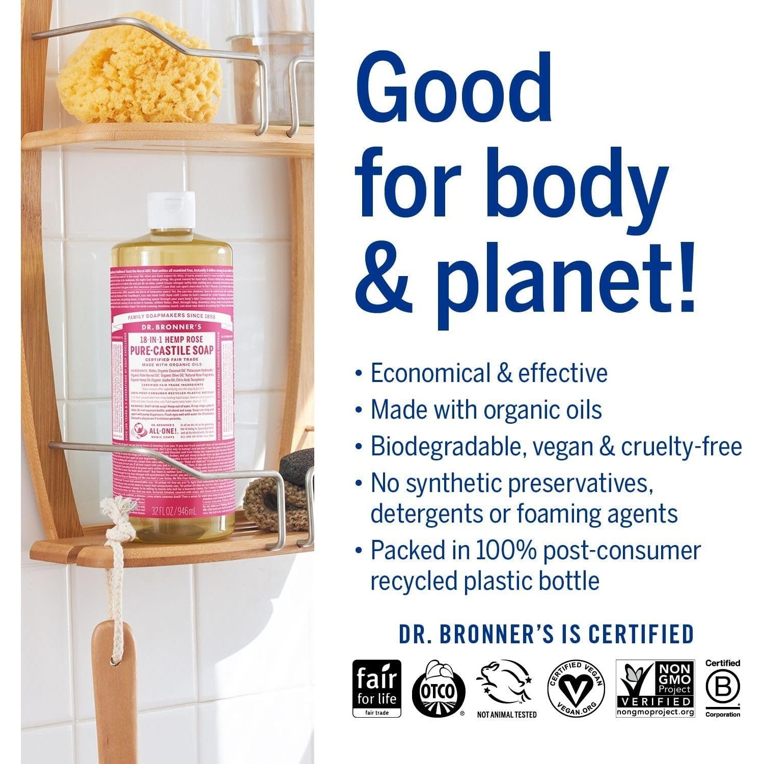 Dr. Bronner’s 18-in-1 Pure-Castile Soaps are good for just about any cleaning task. Face, body, hair – food, dishes, laundry, mopping, pets – clean your house and body with no synthetic preservatives, detergents or foaming agents – none!