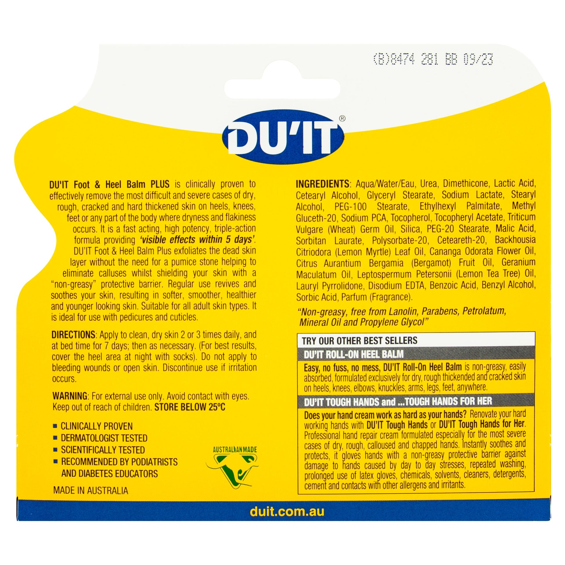 Visible effects within 1 day, DU'IT Foot & Heel Balm Plus is an intensive heel balm cream containing 25% Urea that helps to repair cracked, dry heels.