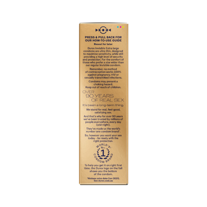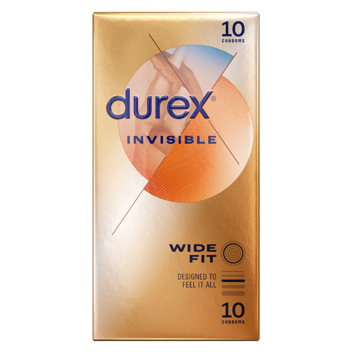 Durex Invisible Larger Condoms are extra thin and wider for a comfortable fit vs Durex originals condom. These condoms are transparent natural rubber latex condoms with silicone lube and larger width for comfort. Durex quality— 100% electronically tested with 5 more quality tests carried out on every batch. Nominal width: 60mm. Comes in pack of 10