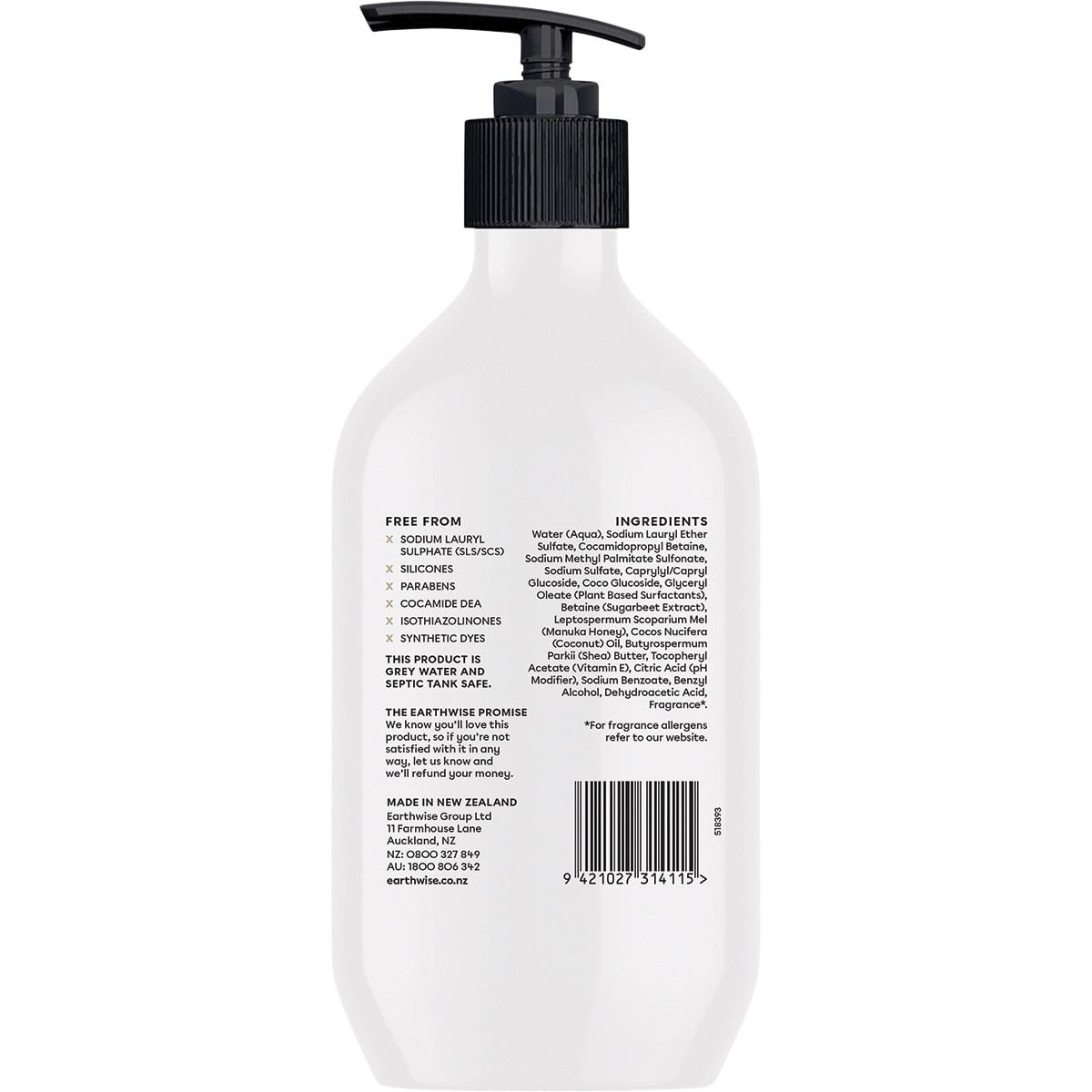 Water (Aqua), Sodium Lauryl Ether Sulfate, Cocamidopropyl Betaine, Sodium Methyl Palmitate Sulfonate, Sodium Sulfate, Caprylyl/Capryl Glucoside, Coco Glucoside, Glyceryl Oleate (Plant Based Surfactants), Betaine (Sugarbeet Extract), Leptospermum Scoparium Mel (Manuka Honey), Cocos Nucifera (Coconut) Oil, Butyrospermum Parkii (Shea) Butter, Tocopheryl Acetate (Vitamin E), Citric Acid (Ph Modifier), Sodium Benzoate, Benzyl Alcohol, Dehydroacetic Acid, Fragrance.