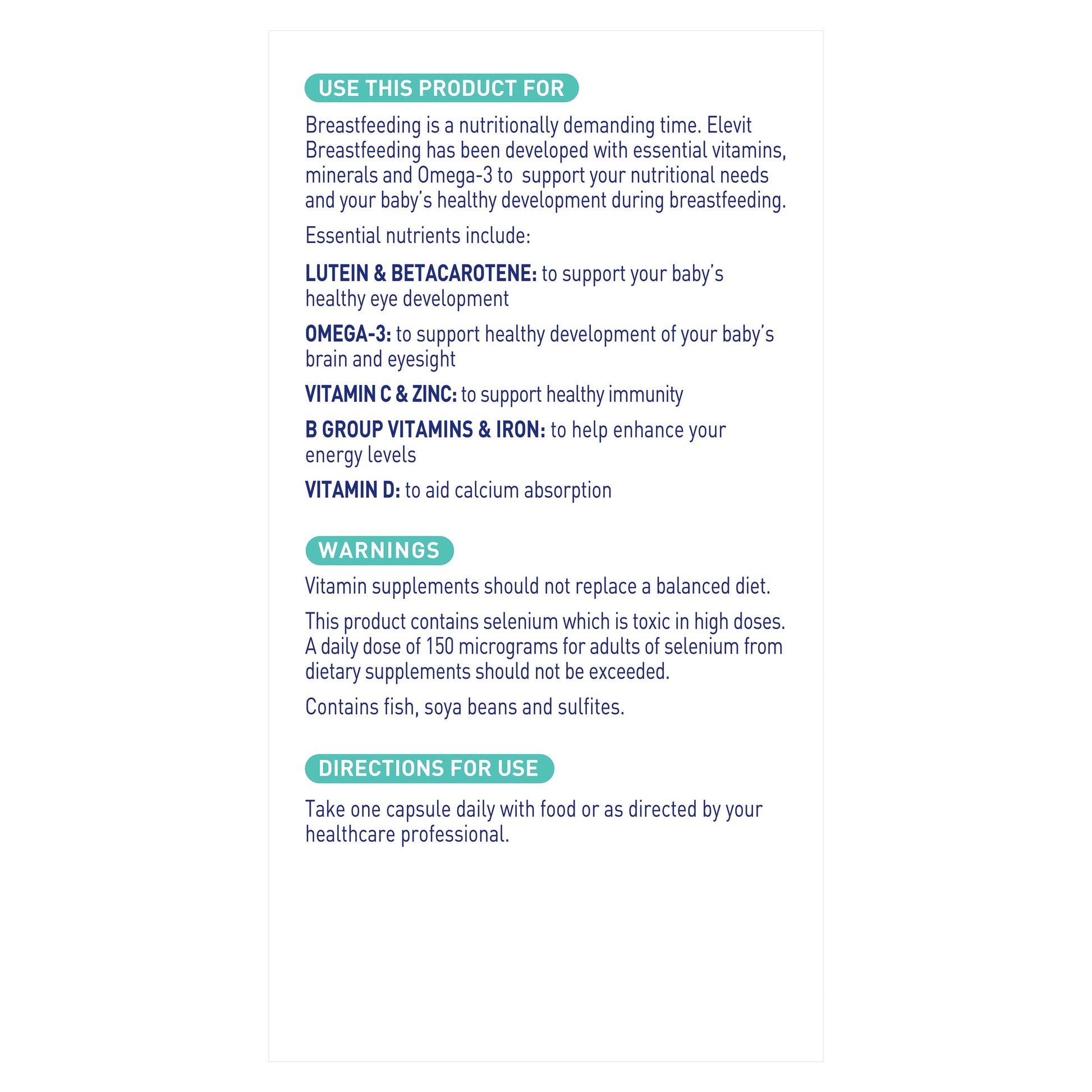 • Elevit Breastfeeding is a tailored breastfeeding multivitamin to help women meet their increased nutritional requirements, for baby's ongoing healthy development.