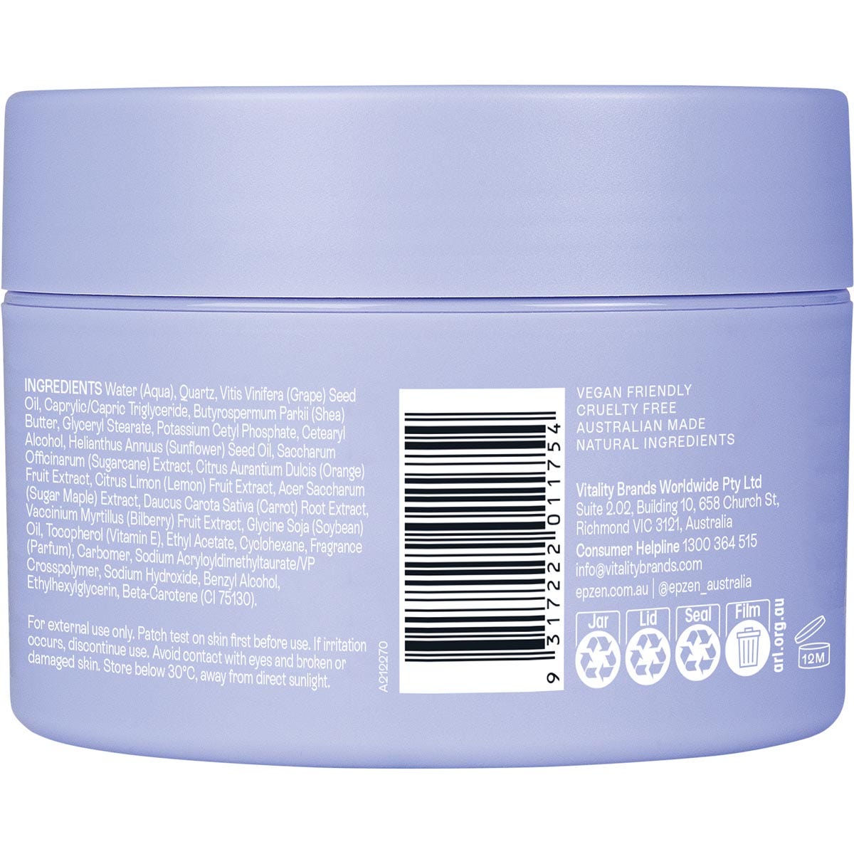 Water (Aqua), Quartz, Vitis Vinifera (Grape) Seed Oil, Caprylic/Capric Triglyceride, Butyrospermum Parkii (Shea) Butter, Glyceryl Stearate, Potassium Cetyl Phosphate, Cetearyl Alcohol, Helianthus Annuus (Sunflower) Seed Oil, Saccharum Officinarum (Sugarcane) Extract, Citrus Aurantium Dulcis (Orange) Fruit Extract, Citrus Limon (Lemon) Fruit Extract, Acer Saccharum (Sugar Maple) Extract, Daucus Carota Sativa (Carrot) Root Extract, Vaccinium Myrtillus (Bilberry) Fruit Extract, Glycine Soja (Soybean) Oil, Tocopherol *Vitamin E), Ethyl Acetate, Cyclohexane, Fragrance (Parfum), Carbomer, Sodium Acryloyldimethyltaurate/VP Crosspolymer, Sodium Hydroxide, Benzyl Alcohol, Ethylhexylglycerin, Beta-Carotene (CI 75130).