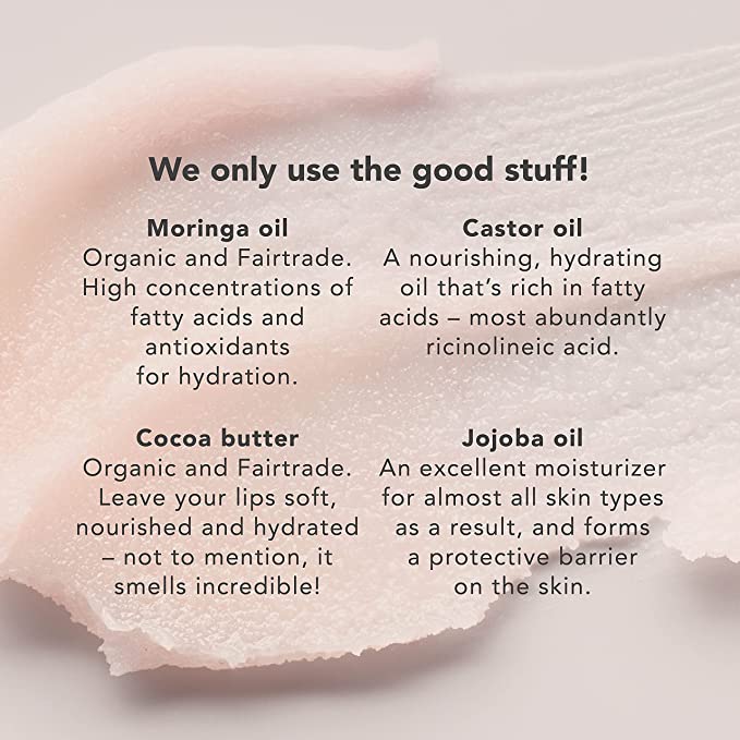 Caprylic/Capric Triglyceride, Theobroma Cacao (Cocoa) Seed Butter^, Euphorbia Cerifera (Candelilla) Wax, Simmondsia Chinensis (Jojoba) Seed Oil, Communis Ricinus (Castor) Bean Oil, Stearic Acid, Mica, Moringa Oleifera (Moringa) Seed Oil^, Iron Oxide, Mentha Piperita (Peppermint) Oil, Limonene*, Linalool*. ^Certified Fair Trade. *Component of Essential Oil.ETQ505EQXLBSUGTCPP