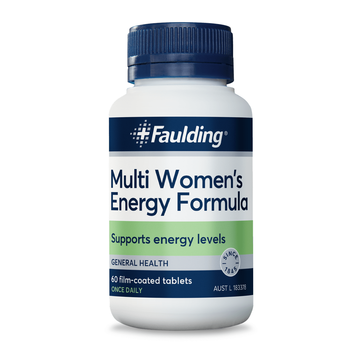 Faulding® Multi Women's Energy Formula contains a wide range of vitamins and minerals to assist you with the challenges of your busy everyday lifestyle and keep you on top of your game. Faulding® Multi Women's Energy Formula supports daily energy levels and immune function. It’s beneficial during times of stress and assists in the maintenance and improvement of general wellbeing.